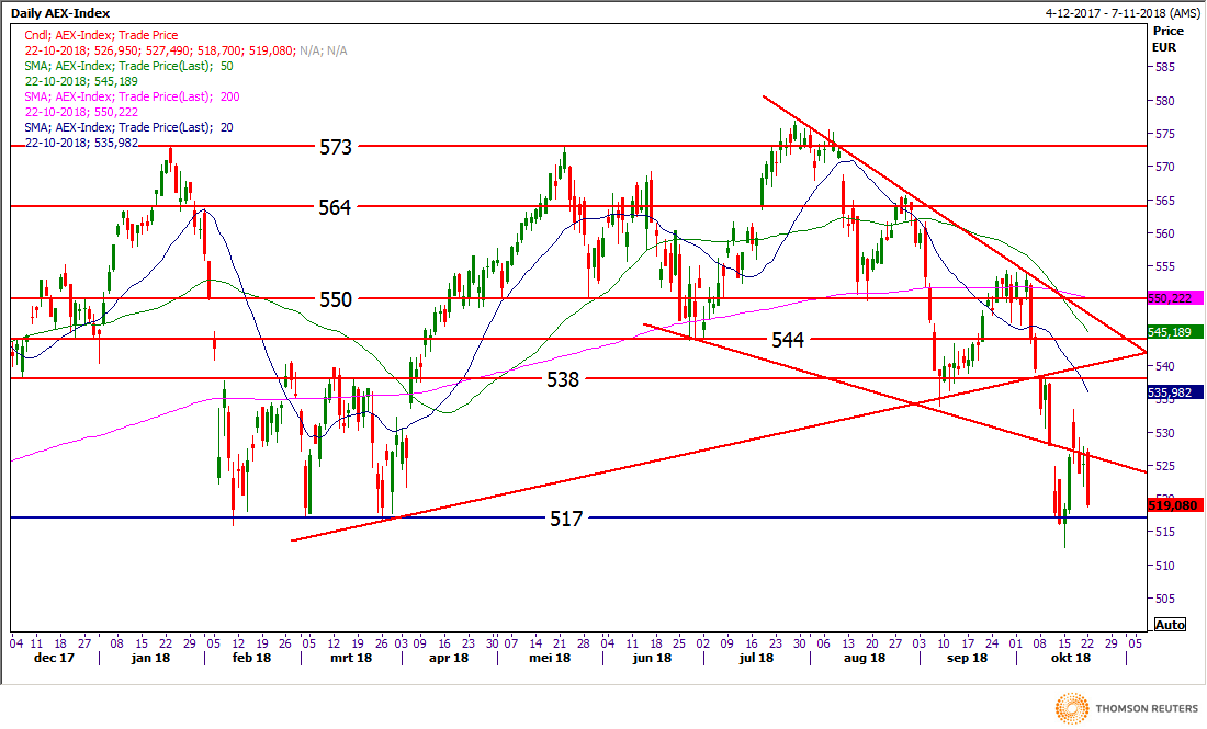 Europa kreeg gisteren al een behoorlijke tik te verwerken met de AEX die 6 punten lager de sessie afsloot, vanmorgen komt er daar nog zo’n 5 punten bij via de futures voorbeurs waardoor de index snel de bodem van vorige week weer kan opzoeken. De 512,5 punten wordt dus belangrijk in eerste instantie, later zien we de 508, de 505 en de 499 – 501 als steun. Er zal dus snel een rebound moeten komen om de AEX ver genoeg van de 500 punten te houden. Weerstand nu de bekende 517, later de 522 – 525 zone. Ook de DAX wil fors lager starten vanmorgen, zo te zien onder de bodem van vorige week die we rond de 11.450 punten zien uitkomen. De index zakt nu wel duidelijk onder de belangrijke 11.500 punten steun waardoor de technische conditie nog slechter wordt. Ook de DAX mag niet te ver doorzakken want anders komen we mogelijk snel onder de 11.000 punten terecht. De markt blijft dus technisch zeer zwak en dat is voor zowel de AEX als de DAX al een tijdje het geval.