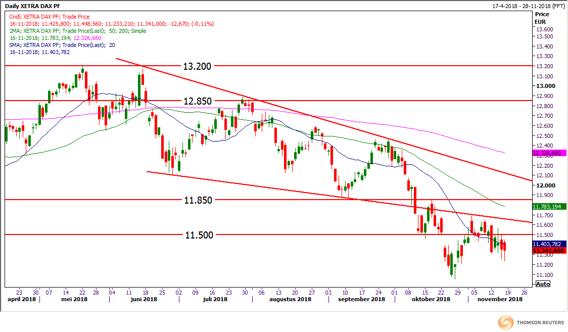 De beurzen beginnen de sessie wat lager vanmorgen, alles zal deze week weer in het teken staan van de ontwikkelingen rondom de Brexit maar nu ook weer volop door het handelsconflict tussen de Verenigde Staten en China. Tijdens de economische top in Papoea-Nieuw-Guinea zijn beide partijen nog niet nader tot elkaar gekomen. Begin deze maand heerste er nog optimisme over een mogelijke spoedige handelsdeal tussen de twee grootmachten maar daar is nog weinig van te merken. Verder krijgen we op Wall Street met een korte week te maken, donderdag zijn de beurzen dicht, vrijdag is er slechts een halve dag handel. Bij de AEX letten we vooral op de steunzone 520 – 521 en de 517 punten, aan de bovenkant letten we op de 528 – 530 punten. Bij de DAX blijft de 11.000−11.100 punten een belangrijke steunzone, we zien weerstand rond de 11.850 punten. Beide indices moeten uitbreken om richting te kiezen voor de rest van het jaar, de vraag is of de markt nu weer een positieve week kan achterlaten.