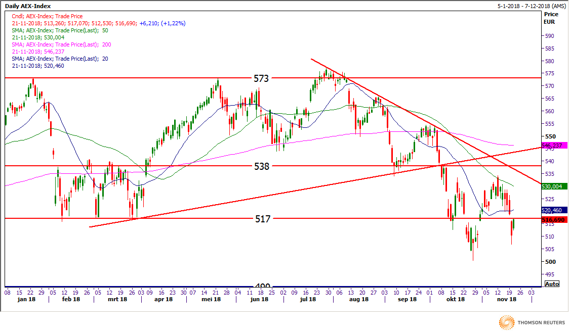Europa kreeg gisteren te maken met de stevige druk op Wall Street, door dat de daling daar meteen groot was moest de AEX terug tot onder de 510 punten terwijl de DAX bijna de 11.000 punten aantikte. Een slechte dag voor Europa met een herstest van de bodemzone van enekel weken geleden. Veel analisten dachten dat de bodem al werd gezet, het tegendeel wordt weer eens bewezen en de markt laat ons zien dat niemand deze beurs goed kan voorspellen. Teveel invloeden op alle vlakken (politiek, economisch, bedrijfsmatig) sturen de markt hoger of lager en dat met grote uitslagen. We moeten ons zien te positioneren in deze markt en waar het kan de kansen zien te pakken. Waar de AEX en de DAX volgende week zullen staan weet ik niet, het kan net zo goed onder de 500 punten zijn maar ook boven de 530 punten (AEX), wat betreft de DAX dan onder de 10.850 of boven de 11.500 punten. Veel zal dus afhangen van wat er op Wall Street zal gebeuren de komende weken, zit er nog een eindejaarsrally in? Of deze keer niet? Op zich is dat ook maar een fabeltje, beurzen doen wat ze willen en kijken niet zo naar het verleden, wel is het zo dat men op Wall Street nog de kans krijgt om het jaar positief af te sluiten, in Europa zal dat niet meer lukken vrees ik.