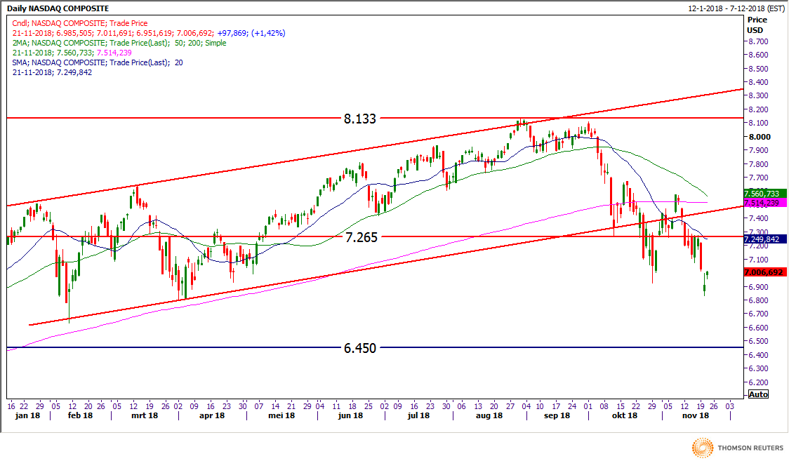 Maar toch blijft het opletten, de indices op Wall Street komen nu onder het niveau van 31 december 2017 terecht en dus negatief voor 2018. De vraag is of dat zal doorzetten de komende weken want dan krijgen we voor het eerst in 10 jaar een negatief beursjaar op Wall Street. Alles is nog mogelijk de komende 5 weken, de kans is wel groot dat er alles aan zal worden gedaan om positief het jaar af te sluiten al lijkt het er nu op dat het moeilijk zal worden. Het lijkt erop dat we te maken hebben met een correctie richting een “Bear Market” en niet met een DIP zoals beleggers gewend zijn geraakt. Als het bij een correctie blijft dan verwacht ik dat na een paar weken de draad wel weer wordt opgepakt, zakken we verder en geraakt Wall Street in een “Bear Market” (indices zakken meer dan 20%) dan ziet het er voor 2019 helemaal niet goed uit.