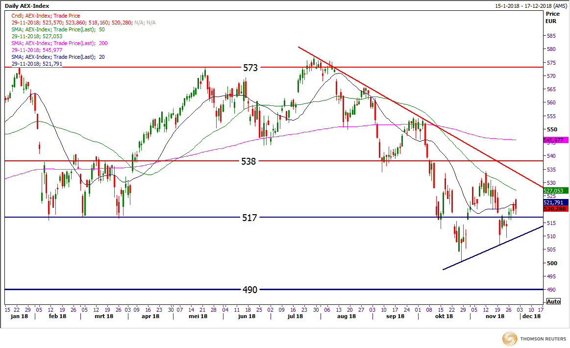 De DAX kan er weer niet in slagen om even een vuist te maken om wat hoger op te lopen, de index blijft zo dicht bij de bodemzone hangen waardoor er niets mag gebeuren voor dat de DAX een nieuwe bodem opzoekt. De AEX is wat dat betreft iets sterker, de index draait al een paar dagen rondom de 520 punten en expireerde daar ook rond deze week. Het is hoe dan ook wachten op wat het weekend zal brengen want de G‑20 TOP is niet onbelangrijk, het kan de markt maken of doen breken, de aanloop was sterk, dat kunnen we niet ontkennen en dan vooral op Wall Street. Europa deed er amper iets mee, we zien zelfs lagere koersen bij de AEX en de DAX de afgelopen dagen, zelfs na de super rally van woensdag op Wall Street.