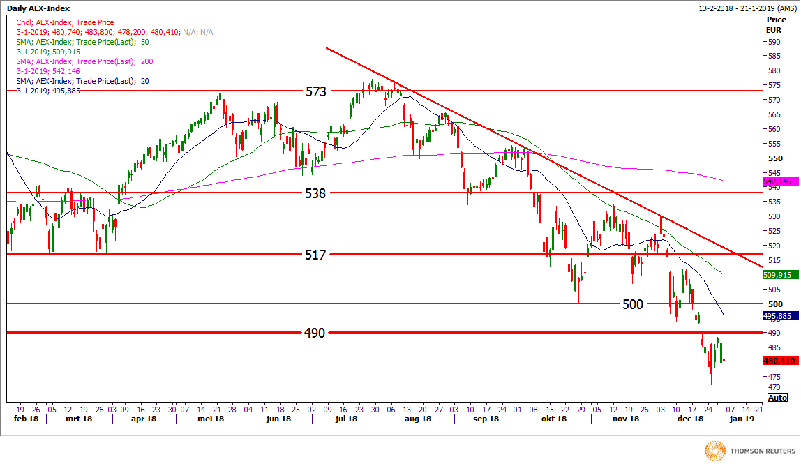 Een sterke dag vandaag op alle markten, de positieve zaken nemen vandaag de overhand tot nu toe, hoe lang dat zal aanhouden is nog maar de vraag want alles wisselt snel tegenwoordig. Een paar scheve woorden over China en de VS, of de FED die de poot stijf zal houden, of volgende week een tegenvaller rondom de Brexit en we weten meteen weer hoe laat het is … Er is weinig aan te doen, snel geld verdienen is mogelijk maar dan moet je goed zitten uiteraard, ik wacht liever nog even, we zijn 4 januari vandaag, de maand en het jaar duren nog lang genoeg, er komen nog wel kansen voorbij. Voorlopig probeer ik een en ander te herkennen wat betreft het gedrag op de markten en ik kan u melden dat het moeilijk in elkaar zit. Aan de ene kant heb je het kamp Trump die van alles en nog wat wil, aan de andere kant is er de economie die wat tegenvalt hetgeen we merken aan de economische data en aan bijvoorbeeld de toch zware winstwaarschuwing van Apple. We gaan het zien, ik kan er geen logica van maken op dit ogenblik, daar ben ik eerlijk in.