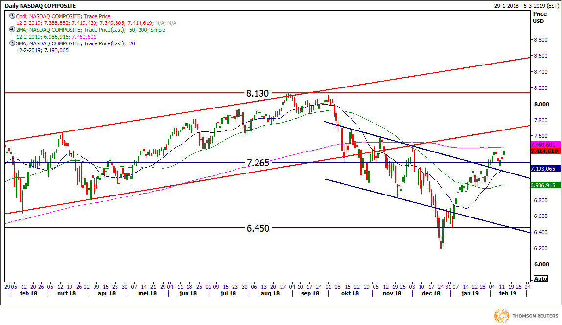 Wall Street loopt stevig op na het bericht dat de “Shutdown” is afgewend door dat beide partijen een akkoord bereiken over de grensafzetting tussen de VS en Mexico, er komt geen muur maar de Democraten zijn akkoord gegaan met een goedkoperen variant zodat Trump een beetje zijn zin krijgt en het item kan afstrepen op zijn agenda. Dat de beurzen daarom zo fors op moeten lopen weet ik ook weer niet, tijdens de shutdown tussen december en midden januari liep Wall Street ook al zo’n 14% omhoog. En dat terwijl er nog altijd geen groen licht komt via de onderhandelingen tussen de VS en China. Kortom, het is weer een dunne draad waar alles aan vasthangt momenteel, we kennen de uitdrukking “The Wall of Fear”, beleggerst stuwen de markt omhoog op hoop dat alles wel goed komt. U weet wat er zal gebeuren zodra er weer eens een vlieg in de soep zit. De items die spelen nu zijn in eerste instantie de economie die afzwakt wereldwijd, verder is het de vraag of de komende kwartaalcijfers nog beter zullen worden en speelt de kwestie VS-China nog volop. Laat de markt maar zijn gang gaan, dat moeten we hoe dan ook accepteren, maar we weten ook dat het in een mum van tijd helemaal anders kan uitpakken. Zie vorige week maar toen de Dow van 25.350 in enkele uren tijd tot rond de 24.900 punten terug moest. We gaan het zien, de stijging voelt niet echt sterk aan geef ik toe en we zien de afgelopen dagen slechts 70% van het normale volume merkt ik op. De S&P 500 tikt het 200-daags gemiddelde aan gisteren op slotbasis, bleef ook een hele tijd handen rond dat punt zonder uitbraak, iets om in de gaten te houden vandaag. Ook de Nasdaq komt rond dat 200-MA terecht nu …