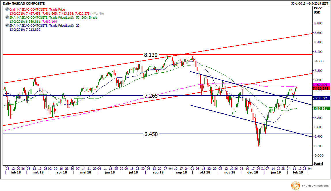 Wall Street blijft op zich sterk liggen al moest de Nasdaq richting het slot wat inleveren om maar net in de plus te eindigen, de Dow Jones wist wel een goeie 100 punten hoger te sluiten en dat bovenop de +400 van dinsdag staat er toch alweer een 500 punten plus in 2 dagen tijd. Waar er nu weerstand wacht moet nog blijken, de Dow Jones staat als enige boven het 200-daags gemiddelde nu, de S&P 500 erop en de Nasdaq er nog net onder. De Dow Jones zal dus de lijnen moeten uitzetten de komende dagen, de recente stijging kwam er niet door sterke economische data of door kwartaalcijfers want die waren er amper en zeker niet binnen de Dow Jones index. Wel komt de stijging door de hoop op een goeie afloop van het handelsconflict tussen de VS en China, iets wat al maanden lang de rode draad binnen het verhaal blijft, zolang men maar kan zeggen dat de onderhandelingen redelijk verlopen duwt dat de beurs al omhoog maar in feite schiet men er al maanden niks mee op. Als we dat vergelijken met de onderhandelingen tussen de VS en Canada en ook met Mexico, dan was alles al in kannen en kruiken in 2 a 3 dagen tijd. Dus we mogen ons gerust afvragen hoe dat zal aflopen, maar zolang er hoop is zal de beurs dat belonen, zodra er weer een negatief bericht komt over die onderhandelingen dan is er zo 3 – 4% vanaf in no-time …