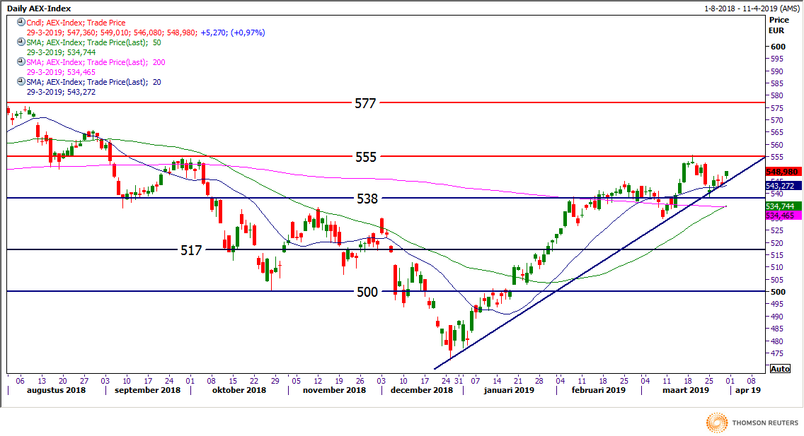 De beurzen in Europa lagen er prima bij gisteren maar na de zoveelste mislukking rondom de Brexit kwam er even een dipje, toch wisten zowel de AEX als de DAX positief af te sluiten. De AEX won 5,2 punten terwijl de DAX 100 punten hoger de sessie afsloot. Technisch bekeken blijft alles nog hetzelfde want beide indices bereiken wel een weerstand maar sluiten er nog niet boven. Bij de DAX letten we nu op de 11.600-11.650 punten met net daarboven de 11.725 punten waar het 200-daags gemiddelde weer wacht. Een uitdaging voor de komende week, geraken de indices hoger en komt er weer een poging richting de jaartoppen (AEX 555 en DAX 11,850)? Of start de week negatief met opnieuw winstnemingen na de rally van vrijdag? Mijn mening is dat we de range voorlopig gaan respecteren en dat de markten opnieuw 1 a 2% omlaag kunnen. We blijven alles uiteraard volgen en waar het kan zal ik op de indices posities uitzetten.