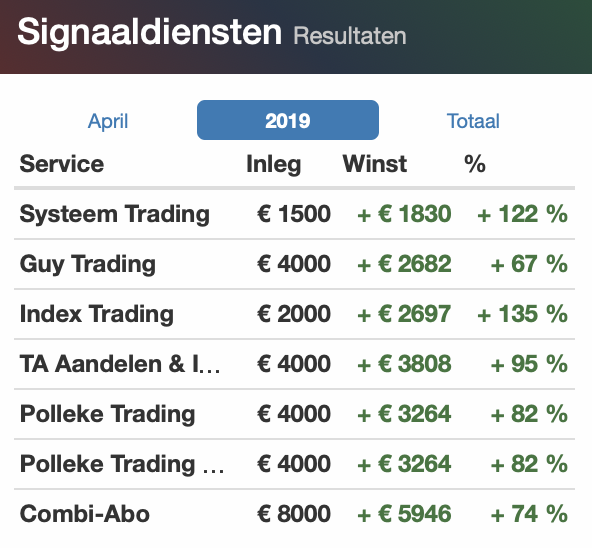 We zijn de maand mei al opgestart en zitten al in een kansrijke positie waar u aan mee kunt doen, via de aanbieding kan dat tot 1 juli voor €39 ... De maand april werd zoals u op de tabel hieronder kunt zien met een mooie plus afgerond en dat is nu voor de 7e maand op rij. Laten we de reeks doorzetten in mei en juni, als lid via de aanbieding kunt u dus volgen, de suggesties worden per mail en SMS naar u verzonden samen met de updates over de markt en de posities.