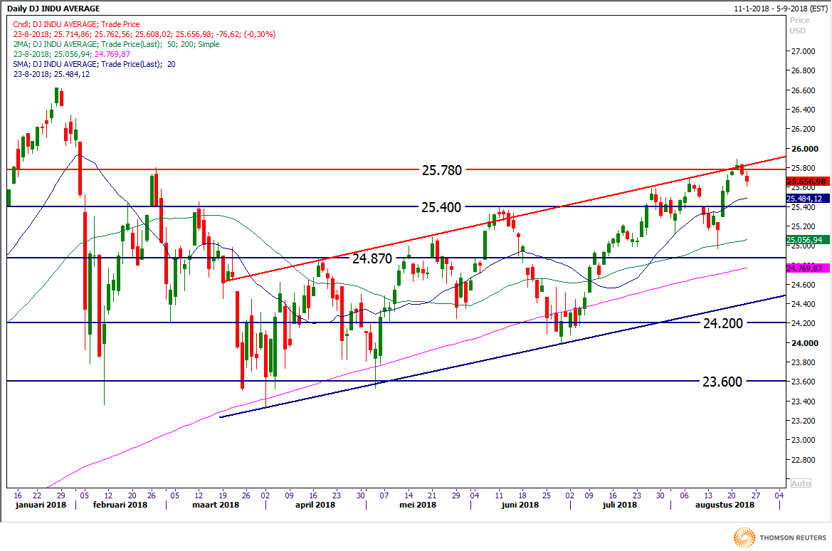 De Dow Jones brak deze week even uit tot boven de 25.780 punten en zette intraday een top neer rond de 25.888 punten en kwam daarbij tot een fractie onder de 26.000 ofwel de volgende weerstand. De index zakte gisteren nog wat verder terug tot de rond de 25.600 steun, verder zien we rond de 25.400 en de 25.200 punten steun. Weerstand nu eerst rond de 25.780 punten, later zien we de 26.000 punten en bij een uitbraak de 26.250 punten als weerstand. De top ofwel hoogste stand ooit wacht rond de 26.616 punten.
