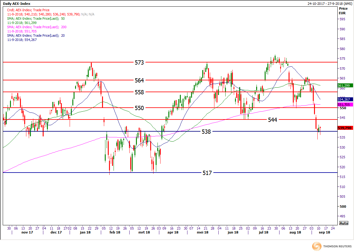 De AEX moest eerst weer wat inleveren maar via de stevige rally na de opening op Wall Street kon de index zich optrekken naar vlak om op dezelfde stand als maandag te sluiten. Weerstand blijft de zone 540 – 541 punten, later de 544 – 545 en de 549 – 550 punten als weerstand. Als de daling terugkomt dan steun rond de 538, de 534 en de 528 punten. Zoals ik eerder al aangaf gaat de daling wel snel maar herstel kost veel kracht en het lukt amper, Wall Street speelt daarbij een grote rol door dat de indices het daar nog niet laten afweten. Het zit er volgens mij wel aan te komen en het probleem wordt dan dat de AEX zeker mee zal doen met de daling. Daarom blijf ik ook negatief rondom de indices hier in Europa.