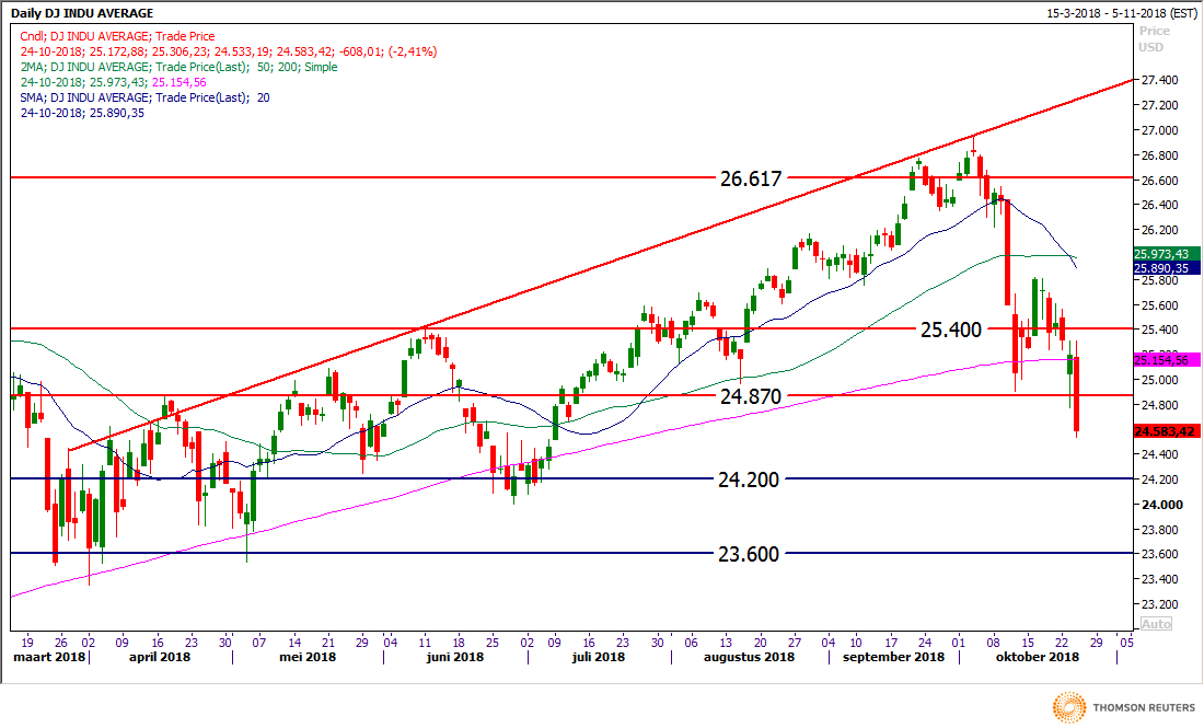 De markt start vandaag in ieder geval positief, Wall Street we zien in ieder geval wat herstellen in tegenstelling tot de zeer zware verliezen van gisteren, de Dow Jones staat ongeveer tussen de 150 en 250 punten in de plus, ik neem de range zo breed omdat het ook vandaag vrijwel alle kanten op gaat. We zien als uitschieters natuurlijk de technologie aandelen die gisteren nabeurs met cijfers kwam dat zijn Microsoft en Intel. Maar we zien dat ook Boeing en Walt Disney weer met mooie plussen voor de dag komen, gisteren ofwel woensdag kwam Boeing met sterke cijfers zodat het aandeel nog steeds aan de bovenkant kan blijven hangen, nog geen correctie merkbaar bij de hoogvlieger Boeing tot nu toe. Toch zien we nog enkele aandelen aan de verlies kant vandaag, dat zijn Procter, Coca-Cola en Merck welke onder de categorie defensieve aandelen behoren. Of Wall Street dat herstel kan vasthouden later vandaag en vooral morgen is nog maar de vraag, de technische conditie blijft natuurlijk nog steeds heel slecht. Belangrijk vanavond na-beurs ofwel na 22:00 uur krijgen we de cijfers van Amazon en Alphabet (Google). Hoe zullen deze cijfers worden ontvangen? Dat zal toch de markt weer een richting opsturen de komende dagen. Nogmaals, Wall Street blijft er zwak bijliggen ook al krijgen we vandaag te maken met een heropleving, de afgelopen weken hebben natuurlijk vaker van dit soort herstelpogingen op gang zien komen die telkens weer werden verkocht de dagen erna.