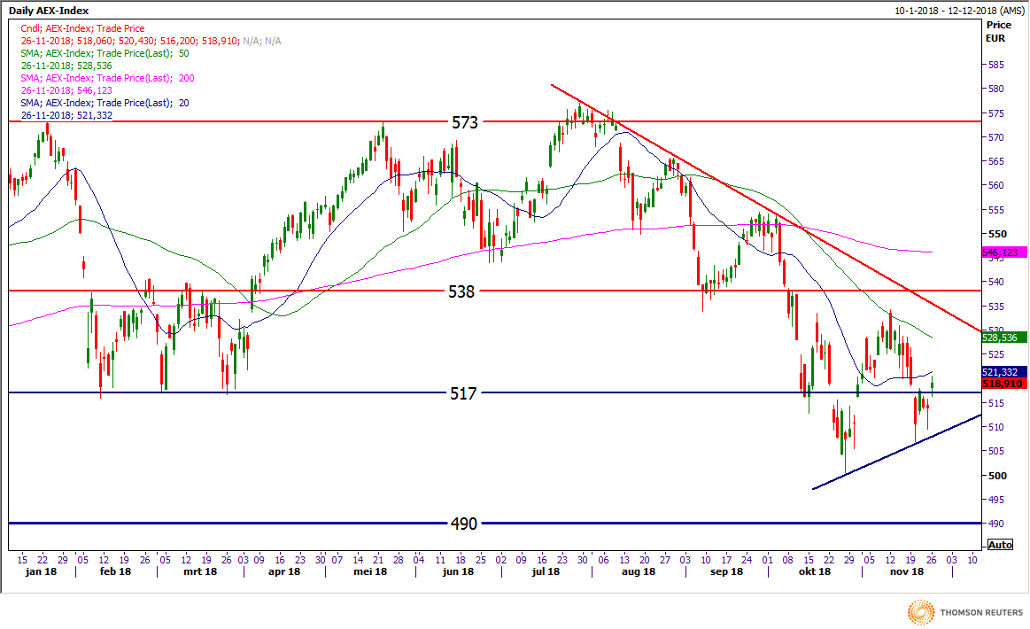 Europa kende een sterke dag gisteren met een mooie rebound vanaf de laagste standen van afgelopen vrijdag, toen moest de AEX even terug tot net onder de 510 punten terwijl de DAX tot rond de 11.100 punten terug moest, er kwam later op de dag herstel en dat werd doorgetrokken maandag zodat de DAX nu rond de 11.350 punten uitkomt, de AEX rond de 519 punten. De ondertekening van het Brexit akkoord en wat kalmte richting Italië zitten daar voor een groot deel tussen maar dat zijn zaken die al zolang meelopen en er eigenlijk niet zoveer meer toe doen. De aandacht gaat nu weer naar het handelsconflict tussen de VS en China, niet dat er geen akkoord kan komen tijdens de G20 maar Trump dreigde weer eens om nog meer zaken extra te belasten als China niet toegeeft. Dat alles en de technische conditie die enorm zwak blijft bij de indices in Europa kunnen weer voor een “Sell the Rally” zorgen. Veel overtuiging zie ik nog niet, de markt blijft vooral twijfelen en kan tot nu toe nog geen enkele keer een stevige rally doorzetten de dagen nadien. De vraag is of dat nu anders zal uitpakken?