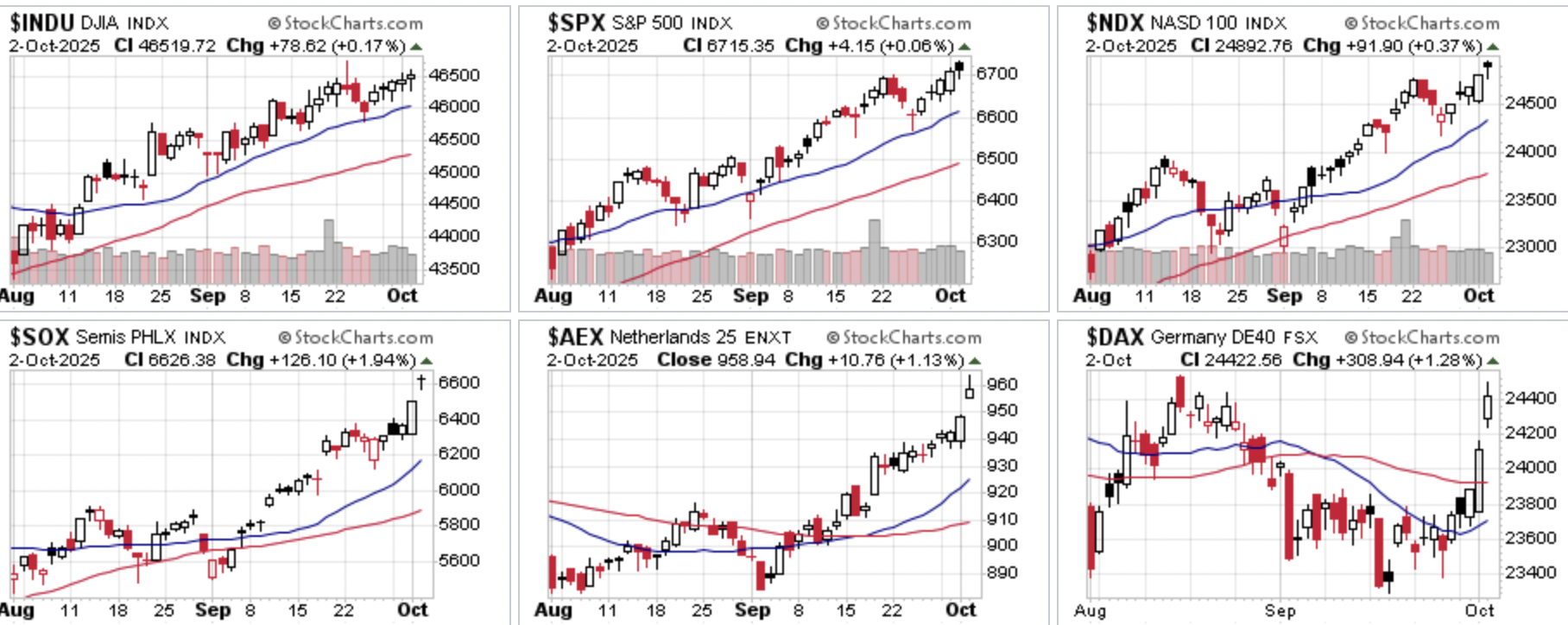 Op Wall Street blijven de indices stijgen, ondanks de overheidssluiting. De waardering van OpenAI stijgt tot boven $500 miljard, waarmee het de meest waardevolle startup ter wereld werd. Zowel de Nasdaq, de S&P 500 als de Dow Jones bereikten donderdag nieuwe records. In Europa zetten de AEX en DAX eveneens een nieuw record neer, vooral dankzij sterke prestaties in chips, metaalsector en de auto sector. De markt wacht op het september banenrapport, maar de publicatie wordt waarschijnlijk vertraagd door de shutdown. DataTrek waarschuwt wel dat de veel te lage sectorale correlaties vaak op een naderende correctie wijzen. Beleggers blijven voorzichtig, terwijl de markt afwacht op een trigger voor een mogelijke draai.