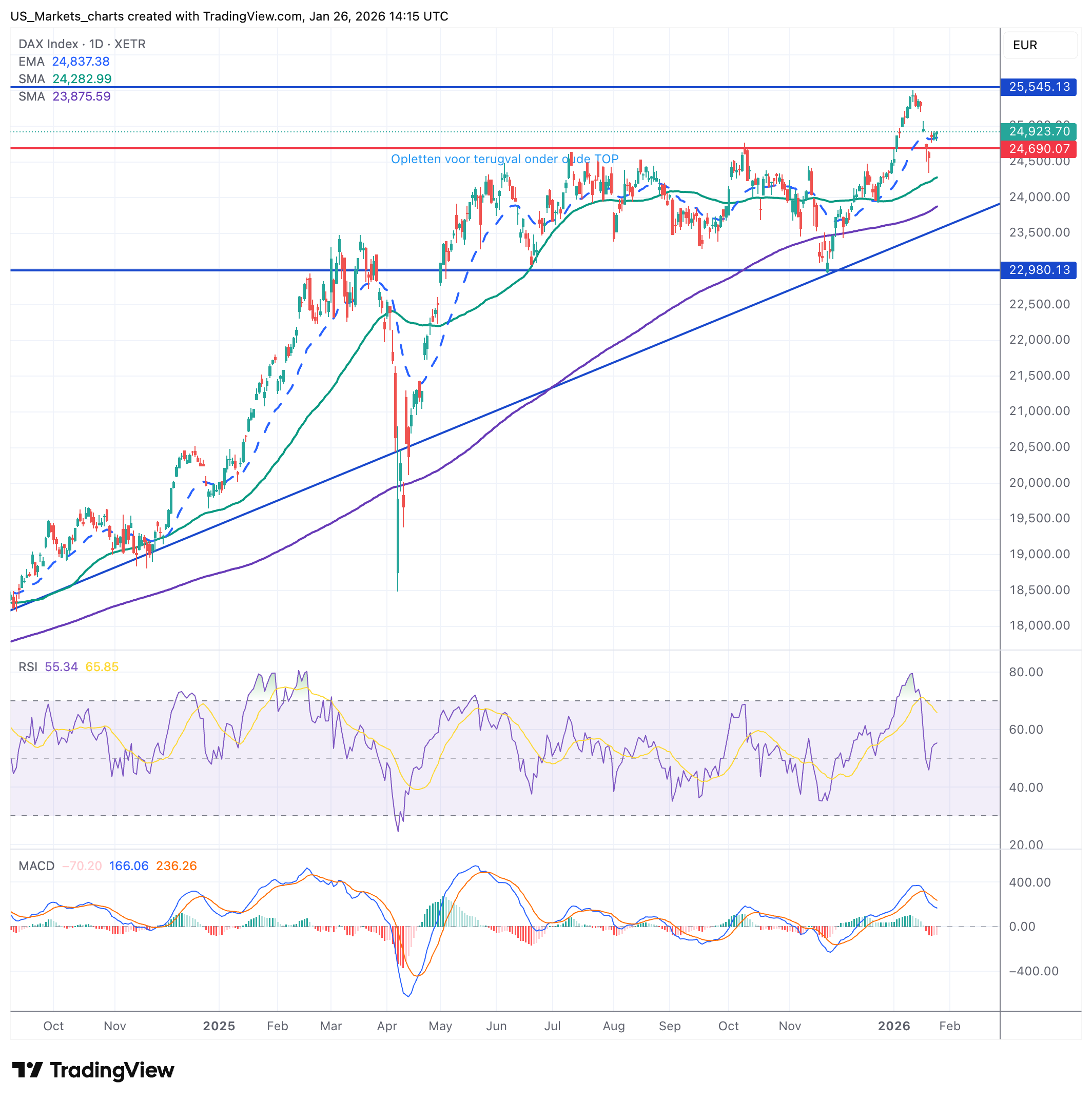 25.450 punten - 1e steun, samenvallend met 20-daags EMA. Dit is het pivotpunt.