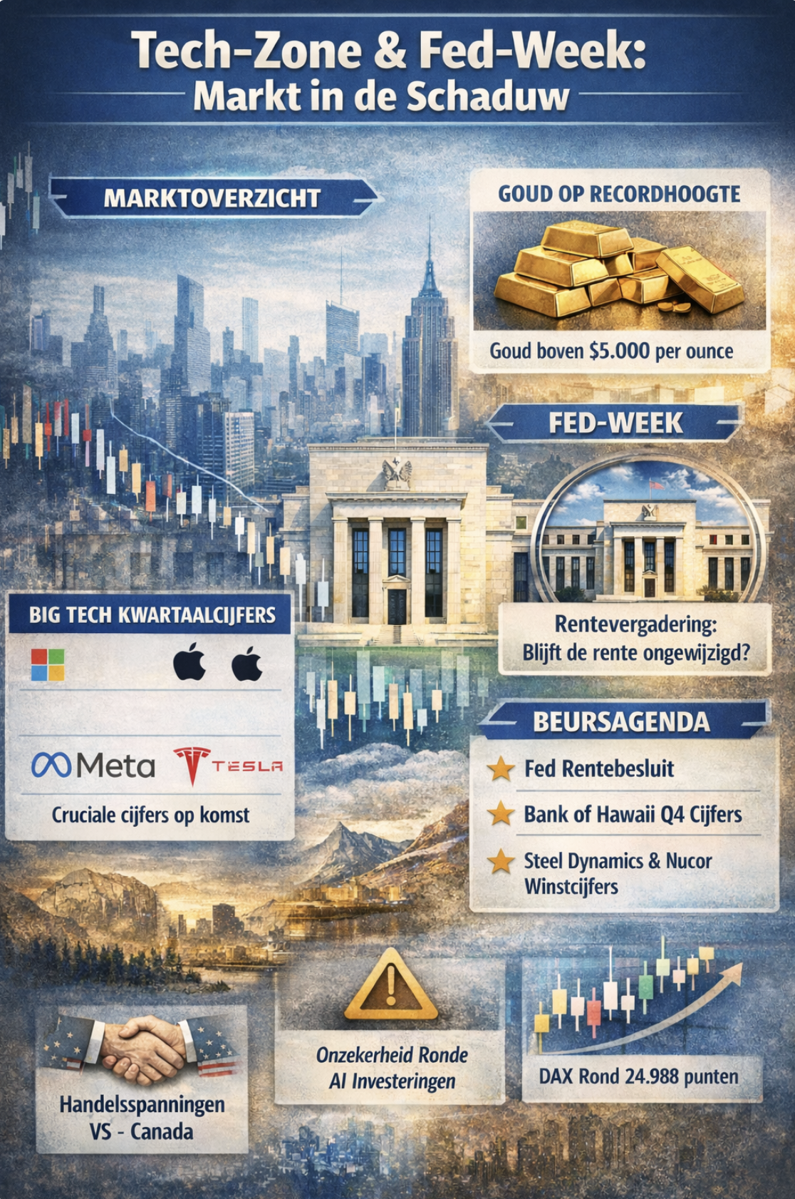 De financiële markten beginnen deze week met een gevoel van voorzichtigheid dat je voelt als een koude wind over de beursvloer. Beleggers zetten hun posities wat opzij terwijl de S&P 500 en Nasdaq futures licht in de min staan en goud records blijft breken boven $5 000 per ounce. De reden? Een zenuwslopende combinatie van belangrijke kwartaalcijfers van Big Tech, potentiële handelsconflicten en de naderende Federal Reserve rentevergadering.