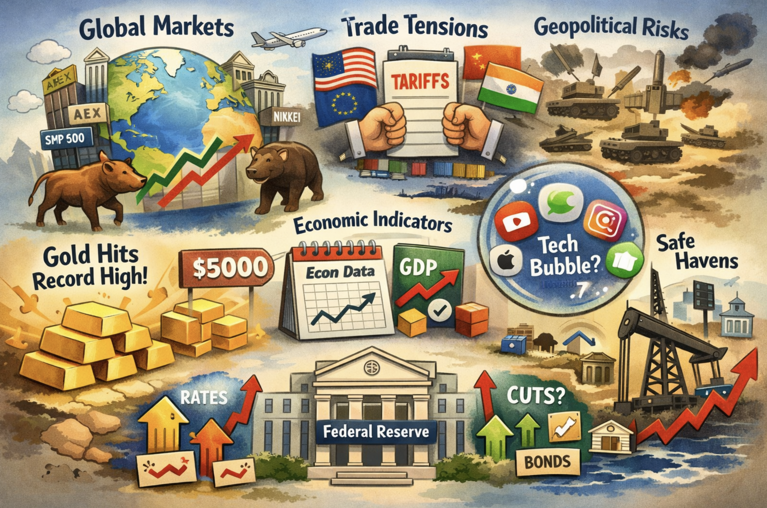 De financiële markten staan deze week op meerdere kruispunten. Zilver schrijft geschiedenis met een ongekende rally die de grenzen van edelmetaalmarkten verlegt, terwijl goud zijn status als ultieme veilige haven versterkt. Big Tech moet bewijzen dat miljarden aan AI-investeringen hun vruchten afwerpen, terwijl de Fed moet aangeven hoe ze omgaat met hardnekkige inflatie en politieke druk. De AEX blijft technisch sterk ondanks lichte correcties, maar internationale ontwikkelingen blijven dominant. Handelstarieven, valutaschommelingen en geopolitieke spanningen zorgen voor een volatiele cocktail waarbij actief risicomanagement cruciaal is.