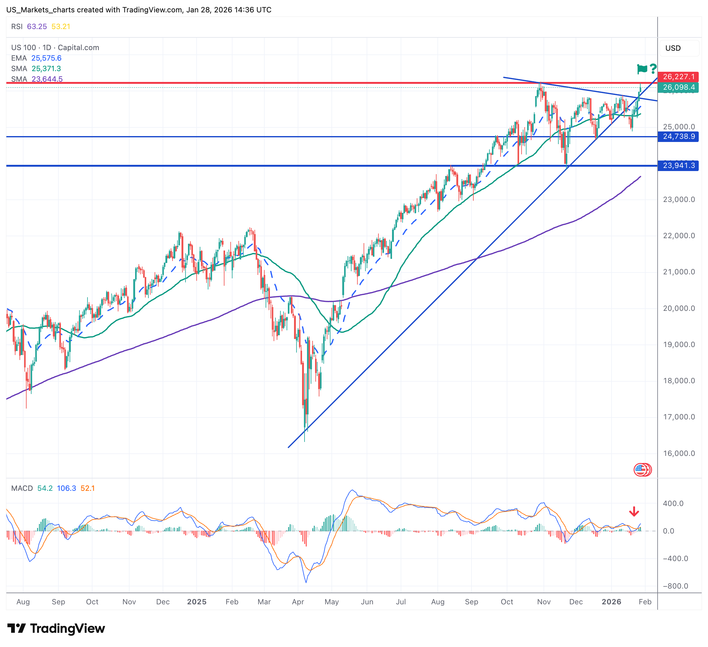De Nasdaq 100 sloot gisteren rond de 25.940 punten. Technisch gezien blijft de trend stevig opwaarts: