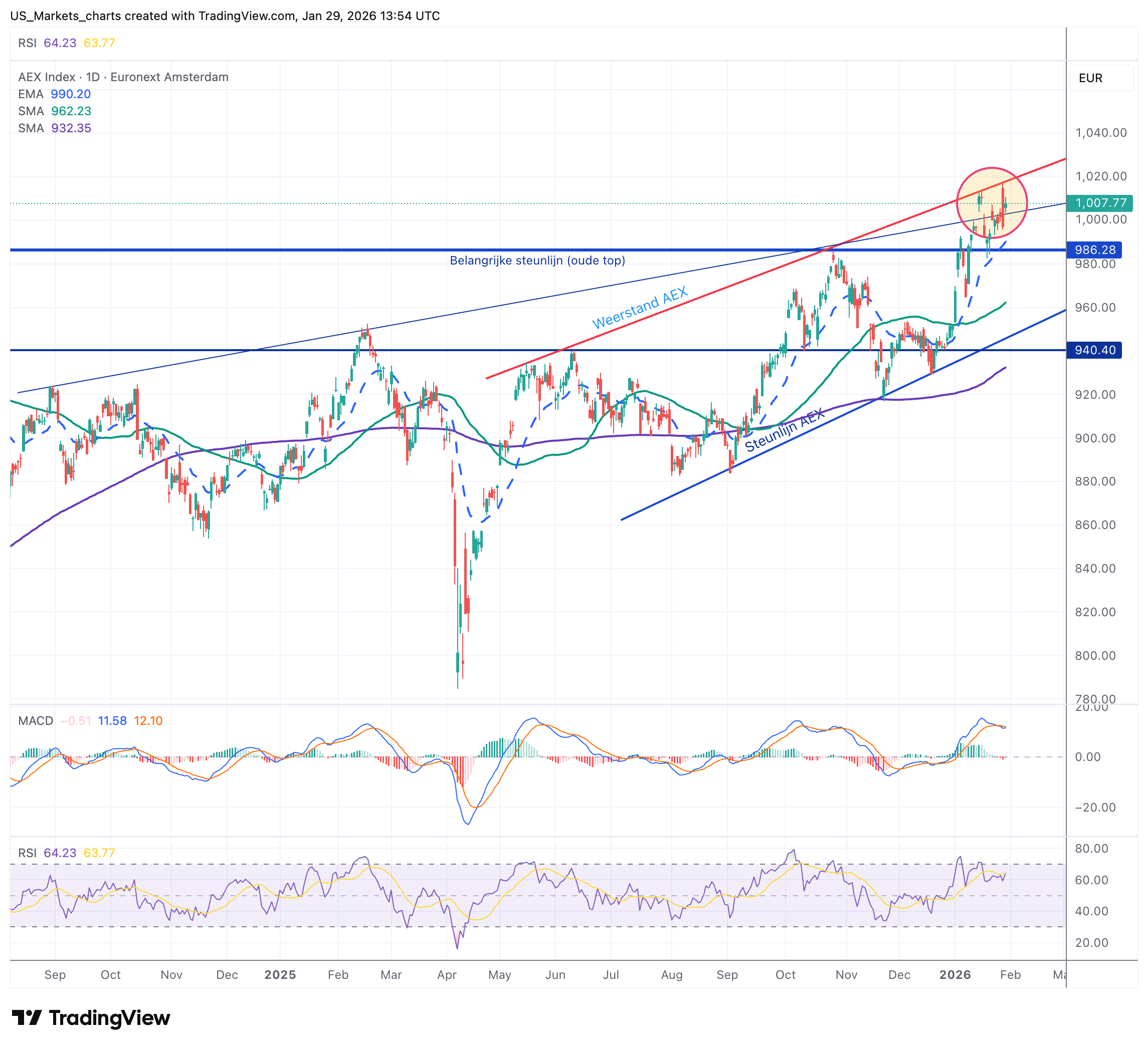 Trend & Steun: De middellange termijn trend is onmiskenbaar positief. De index vindt solide steun op de 990-lijn, maar de belangrijkste graadmeter voor de komende dagen is of de nieuwe grens van 1.000 punten als steun kan standhouden.