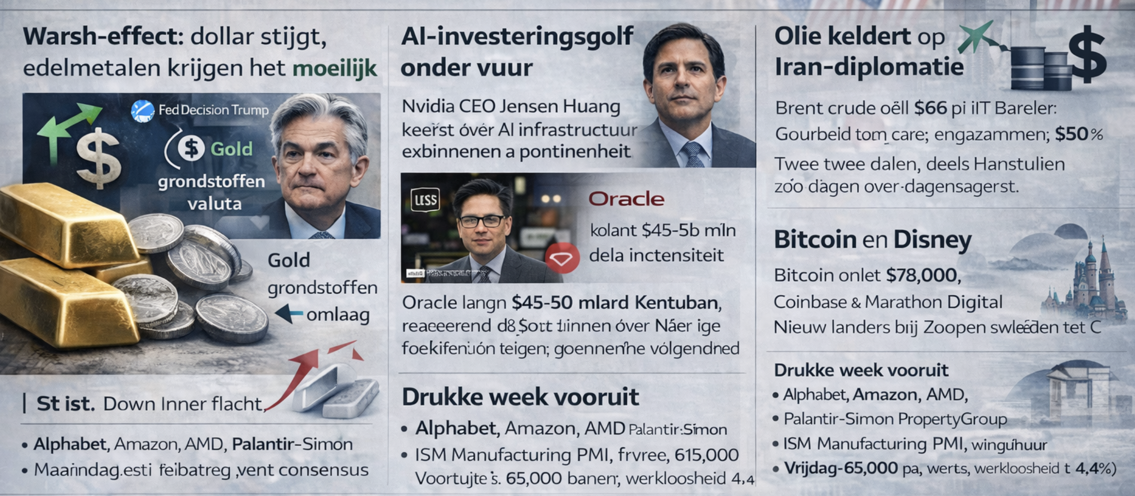 Maandag: Inkoopmanagersindices Europa en VS, Palantir en Walt Disney komen met cijfers. Dinsdag: ISM Manufacturing PMI (VS), een graadmeter voor industriële gezondheid in 2026. AMD, Merck en Pfizer komen met cijfers. Woensdag: ADP-job rapport (VS), Alphabet en Eli Lilly komen met cijfers Donderdag: Britse centrale bank-besluit, Europese detailhandelsverkopen en nabeurs Amazon dat met cijfers komt. Vrijdag: Banenrapport VS (Non-Farm Payrolls), werkloosheid en het gemiddelde uurloon
