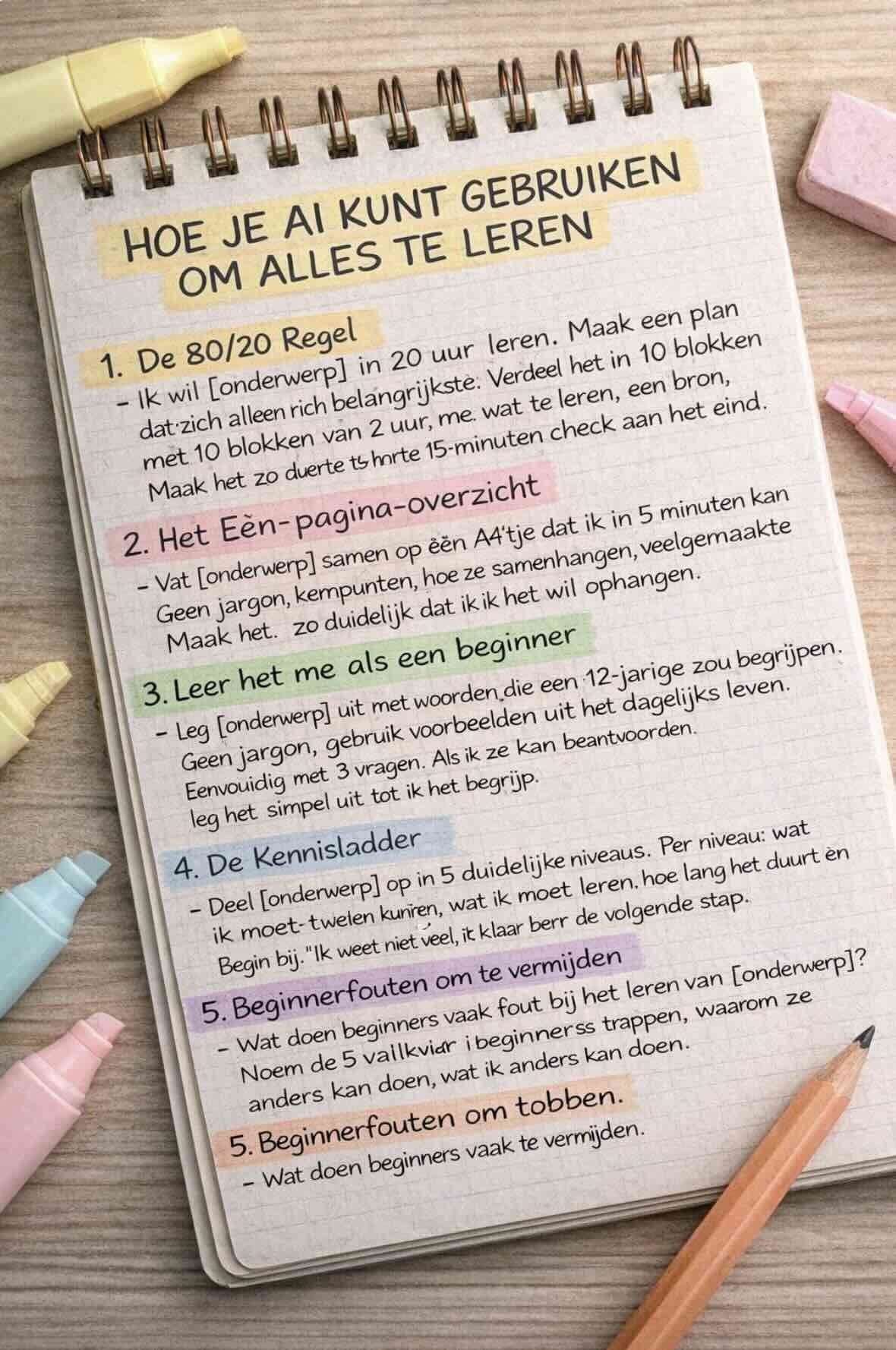 - De Kennisladder: Verdeel een onderwerp in vijf niveaus en laat AI per niveau uitleggen wat je moet leren. Dit geeft structuur aan je kennisopbouw, van "ik weet niets" tot expert.