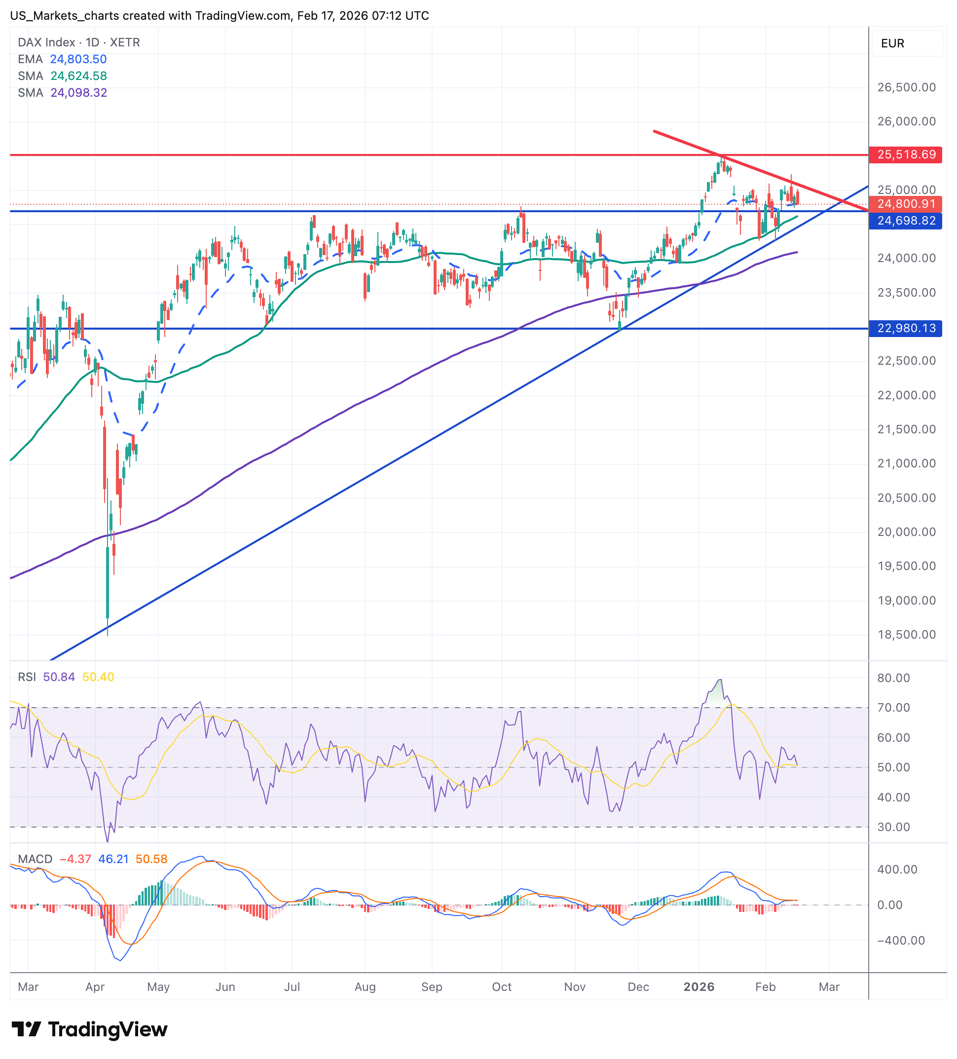 De DAX zit nu gevangen in een driehoek aan de bovenkant van de range, de index kon nog net rond het 20-daags gemiddelde sluiten dat rond de 24.803 punten uitkomt. Het 50-daags gemiddelde wacht nu als zeer belangrijke steun rond de 24.625 punten. Let ook op de steunlijn onder de bodems samen met de horizontale steun rond de 24.700 punten.