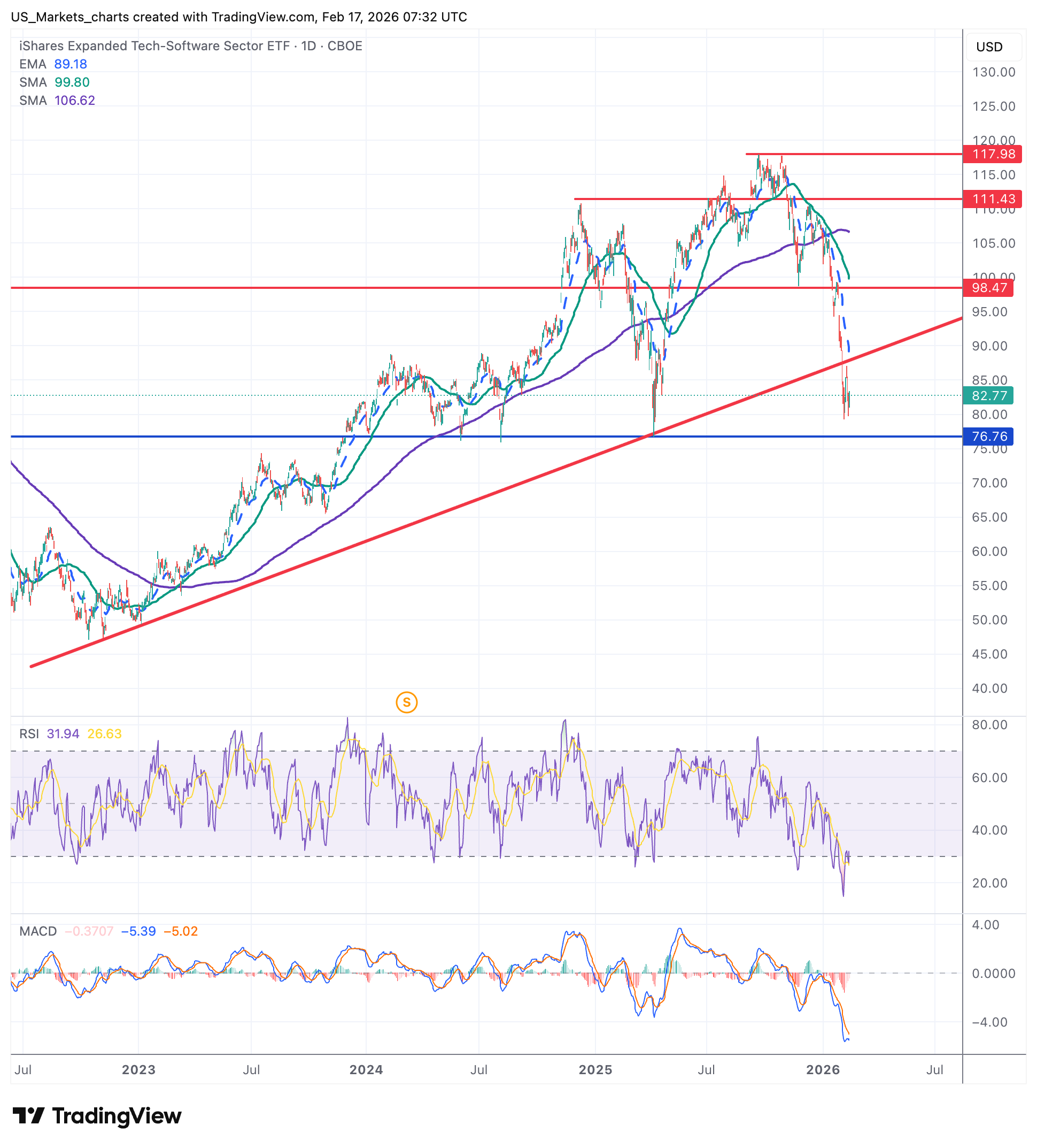 De MAGS-ETF sloot nog net boven het cruciale 200-daags gemiddelde. Technische analisten wachten al op doorbraak onderuit. Eenmaal eronder kunnen we steun verwachten rond de $55. Op weekbasis verloor de MAGS zo'n 3%.