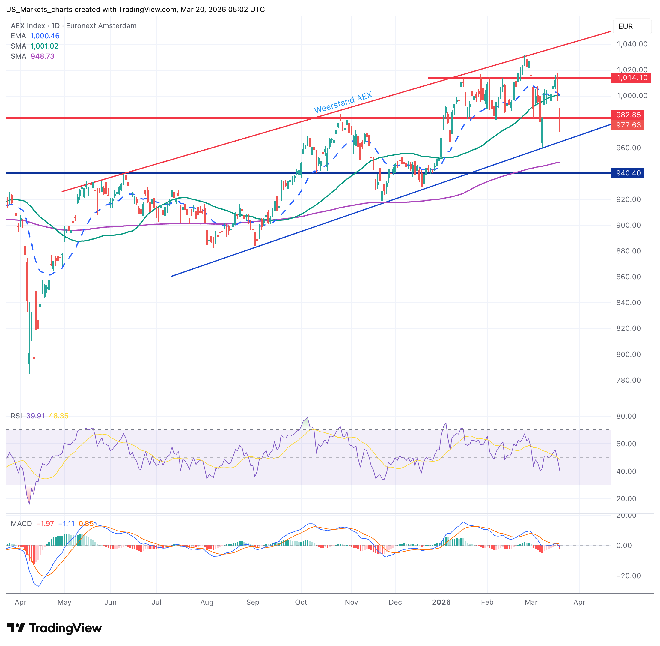 Scenario bull: positief weekslot op Hormuz-optimisme, AEX herneemt de 1.000 en bevestigt EMA-20 als steun. Doorbraak boven 1.014 opent weg naar nieuwe records. Scenario bear: negatieve MACD-crossover bevestigt zich, olie blijft toch langer dan verwacht boven de $105, de AEX verliest de 949 punten steun zone en zakt verder door.