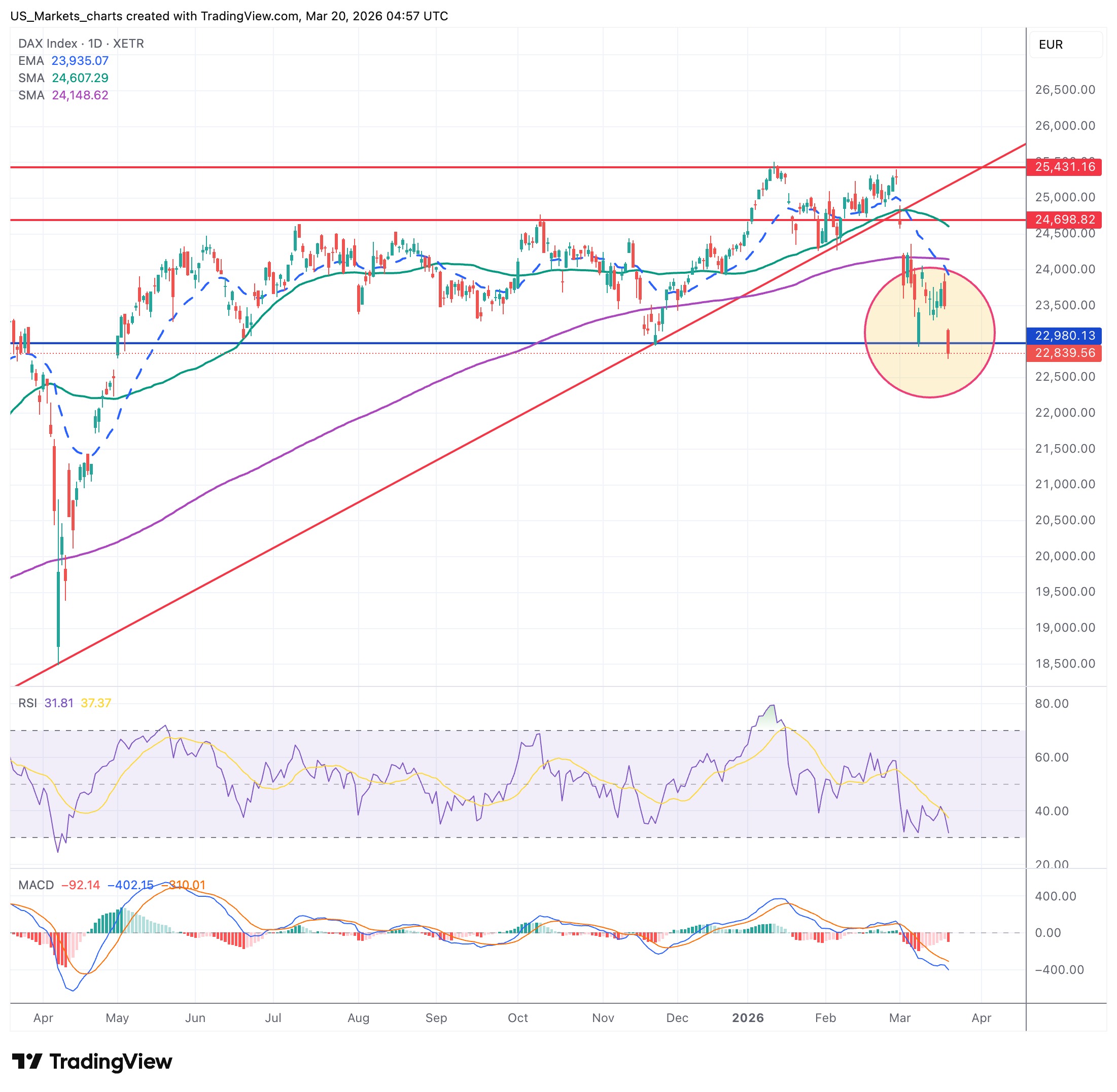 De DAX noteert op 22.840 en staat daarmee onder alle drie de voortschrijdende gemiddelden. De EMA-20 staat op 23.935, de SMA-200 op 24.150 en de SMA-50 op 24.600. De index heeft in enkele weken een val gemaakt van boven de 25.500 naar 22.750, een daling van meer dan 10% tot de voorlopige bodem er stond. Het SMA-200, normaal een langetermijnvloer, wordt nu een belangrijke weerstand. Dat is een kenmerk van een index die structureel onder druk staat, niet alleen tijdelijk.