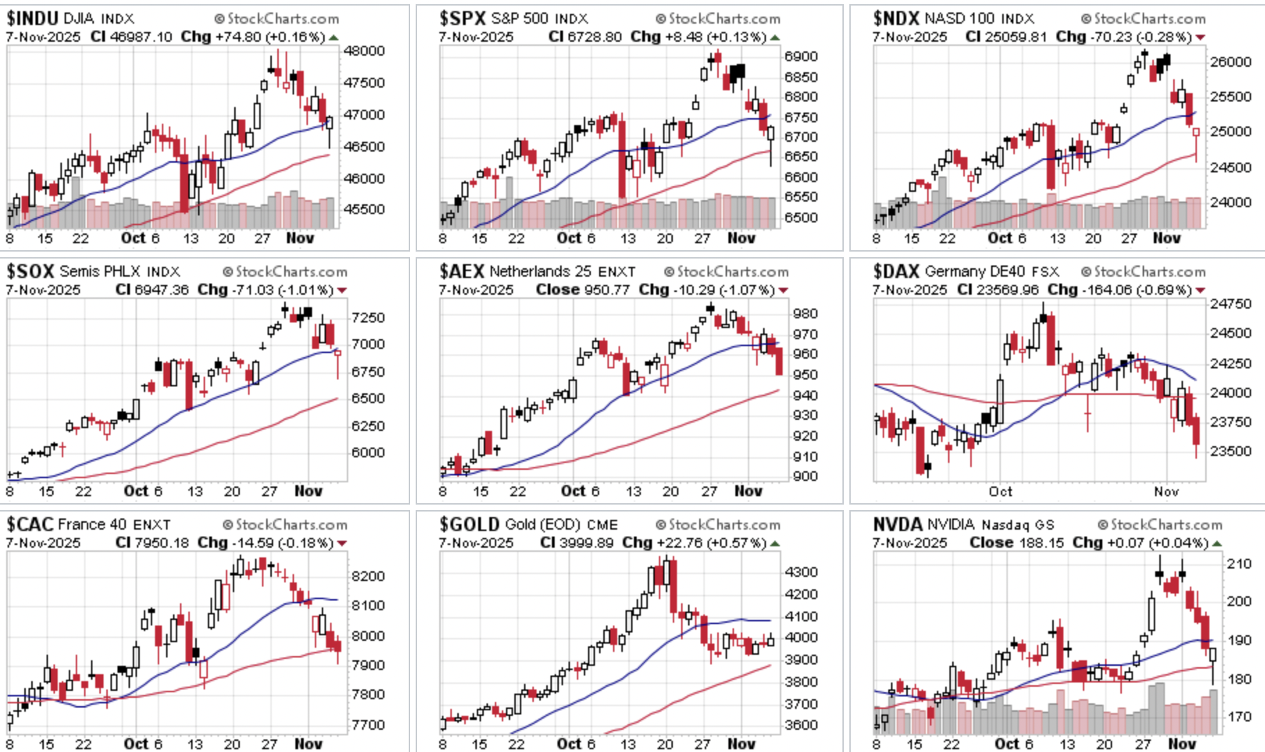 De grafieken tonen duidelijk dat veel indices hun 50-daags gemiddelde naderen. Zolang die steunzones standhouden, blijft het bij een gezonde correctie, maar een doorbraak omlaag zou de deur openen voor een diepere daling.
