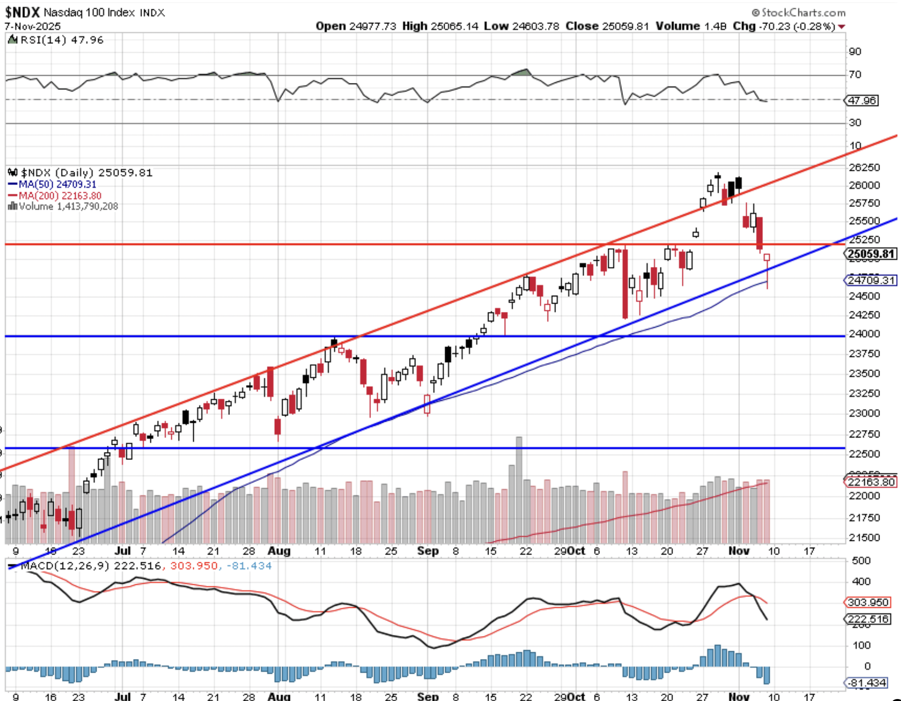 De Nasdaq 100 bevindt zich in een fase van afkoeling. De steun rond 24.700 punten is nu cruciaal. Een herstel boven 25.500 zou het beeld herstellen, maar zolang dat niet gebeurt, overheerst voorzichtigheid.
