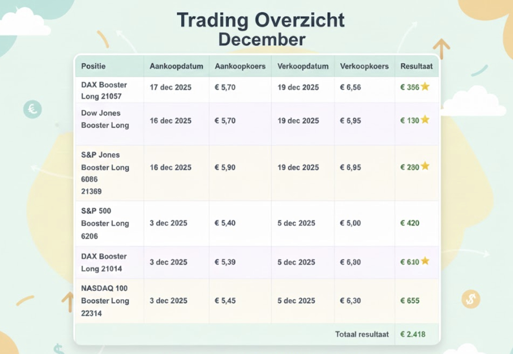 In 2026 wordt het ook een nieuw jaar voor wat betreft de beurzen, en we gaan het wat betreft US Markets ook helemaal anders aanpakken, de huidige tijd vraagt daarom en we moeten vooral mee met de tijd om tot betere resultaten te komen. We gaan nog wel werken met Turbo's en Boosters zoals je gewend bent maar wel anders en vooral meer en dus diverser. Volg ons meteen vanaf 2026 met de compleet nieuwe opzet, waar ik vooral ook meer met AI ga werken zodat er meer handel mogelijk wordt en voor jezelf als lid is er dan vanzelfsprekend meer keuze.