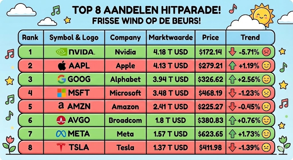 🥇 1. NVIDIA ($4.18T): De huidige koning van de dansvloer staat op 1, maar... oei! Zie je die -5,71%? Nvidia is vandaag gestruikeld over zijn eigen veters. Ze staan nog net bovenaan, maar ze kijken nerveus over hun schouder. Ze zweten peentjes in dit geval.