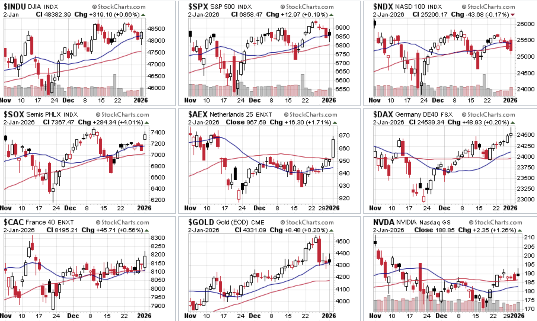 Het is vrijdag 2 januari 2026 en de markt begint het nieuwe jaar met een positieve ondertoon. De jaarafsluiting op 31 december 2025 liet Wall Street nog wat winstnemingen zien door "Window Dressing", vooral bij de technologie en de energie. Het werd een sessie met lage volumes.