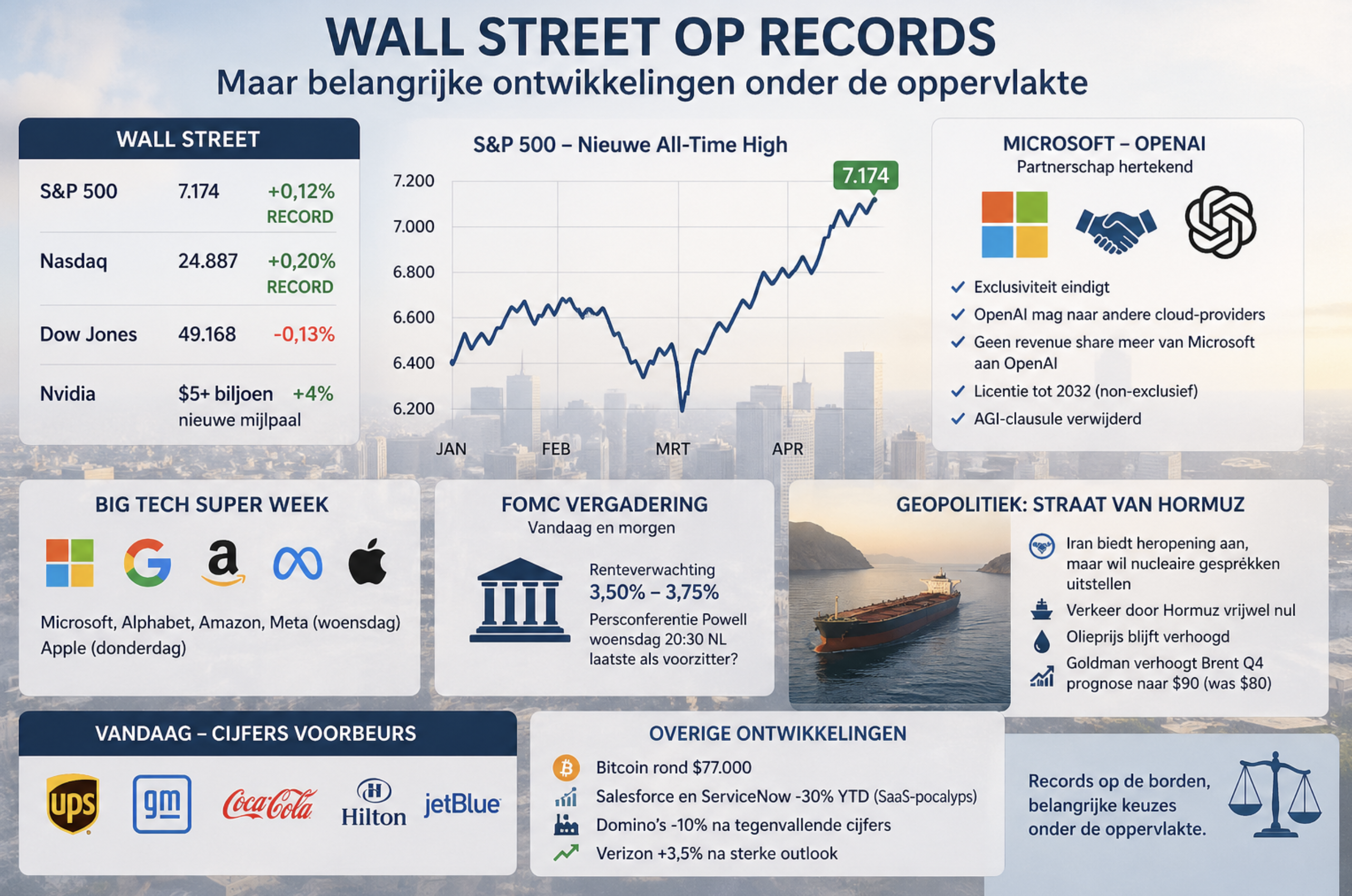 Wall Street klopte woensdag alle records aan. De S&P 500 sloot plus 1,05% op 7.137,90, de Nasdaq plus 1,7% op 26.937, beiden met een nieuw record. Tesla kwam na slot met cijfers die op bijna alle fronten beter waren dan verwacht, maar het aandeel gaf zijn aftermarket-winst helemaal terug na een capex-verhoging van $5 miljard. Ondertussen klopt de realiteit weer aan de deur: Brent schiet weer fors omhoog en staat vanmorgen op $103 per vat, omdat Iraanse patrouilleboten op drie schepen schoten in de Straat van Hormuz. Japan zakte vanochtend weg onder dat oliegeweld. De Europese futures staan vanochtend lager, een lagere opening ligt in de lijn der verwachting. Ook op Wall Street staan de futures lager vanmorgen.