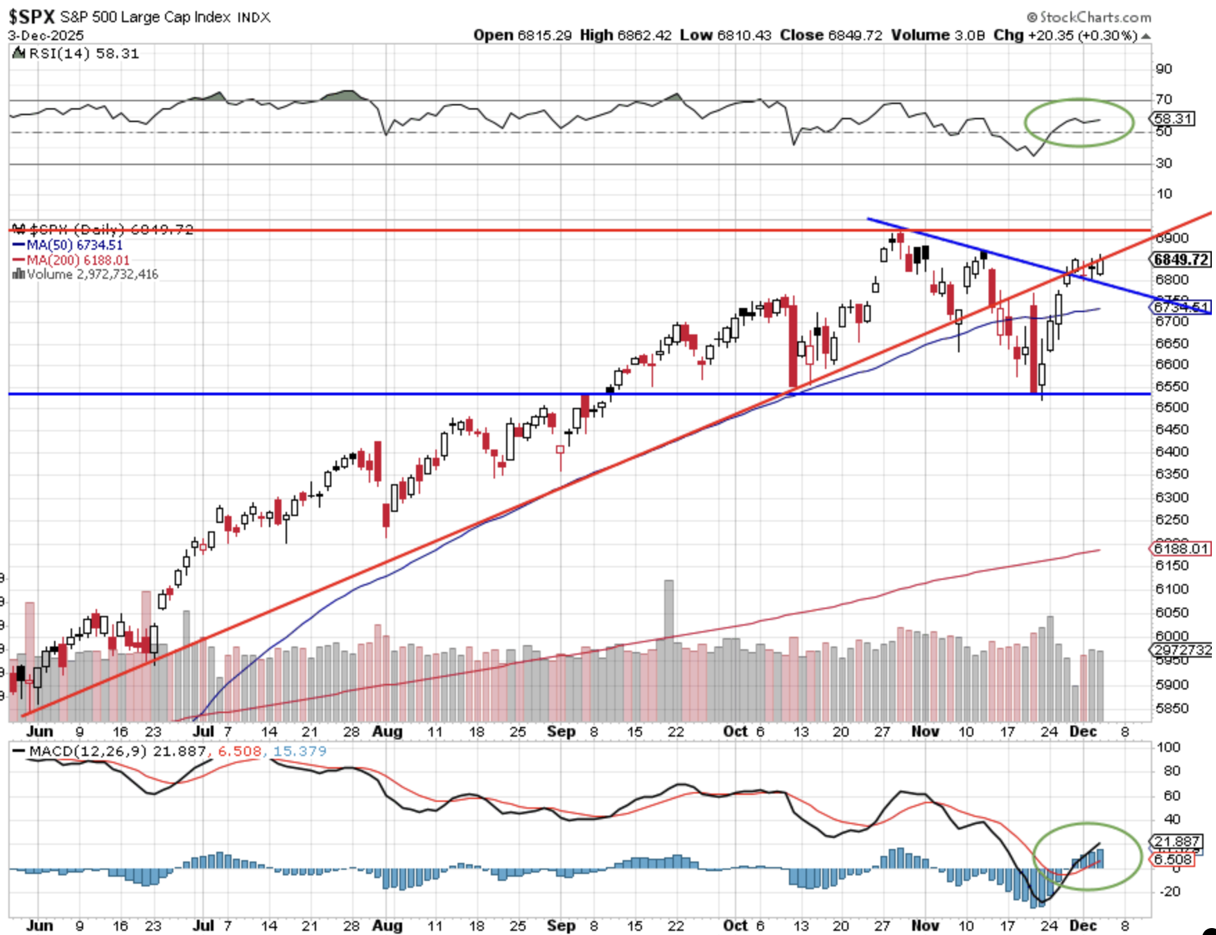 De S&P 500 heeft de recente correctie netjes kunnen opvangen boven de horizontale steunzone rond 6.550–6.600, waarna er vanaf vorige week een krachtige rebound volgde tot net boven de dalende blauwe trendlijn over de toppen vanaf eind oktober en tot de eerdere stijgende rode steunlijn. Dit suggereert dat de correctieve fase mogelijk is afgerond en de primaire uptrend weer de regie overneemt.
