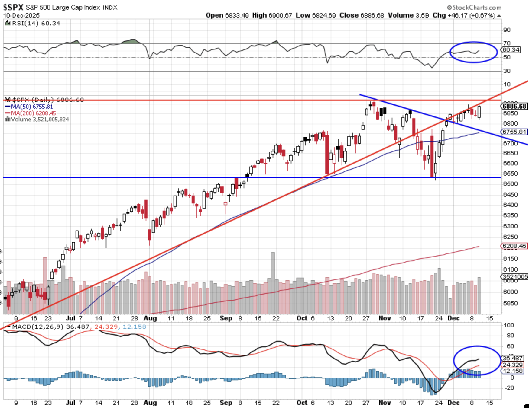 De daggrafiek van de S&P 500 toont een nog steeds stijgende hoofdtrend, ondanks een breuk van de rode stijgende trendlijn tijdens de novembercorrectie. De recente hogere bodem boven circa 6.650 en de huidige test van de toppen rond 6.900 houden het patroon van higher highs en higher lows in stand.