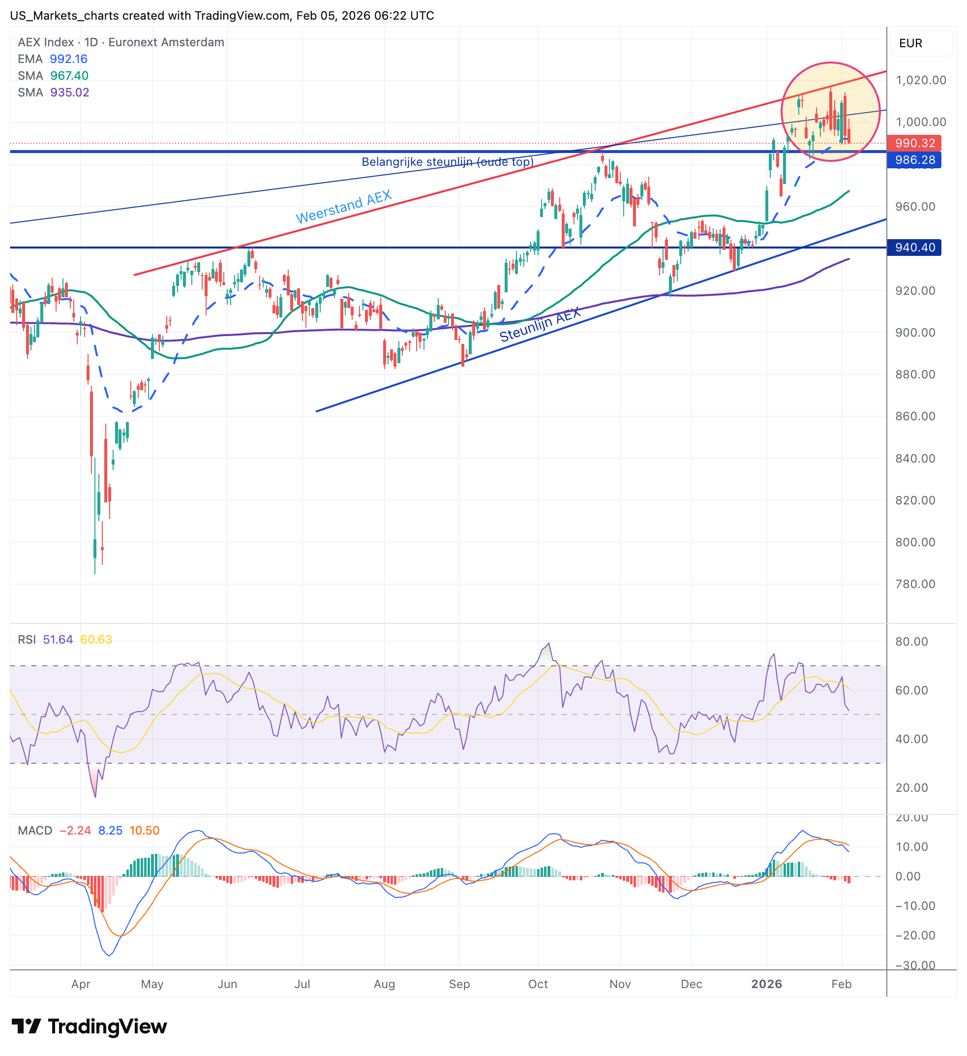 We kunnen het omschrijven als een sentiment dat voorzichtig tot negatief overkomt, dat sluit meteen ook aan op wereldwijde rotatie uit risk-assets want door de zwaar wegende chip-bedrijven binnen de AEX is de index net zo kwetsbaar. Break onder 980 punten zou risico op verdere daling vergroten, terwijl een uitbraak boven 1.010 een eerste teken van hoop op meer kan bieden.