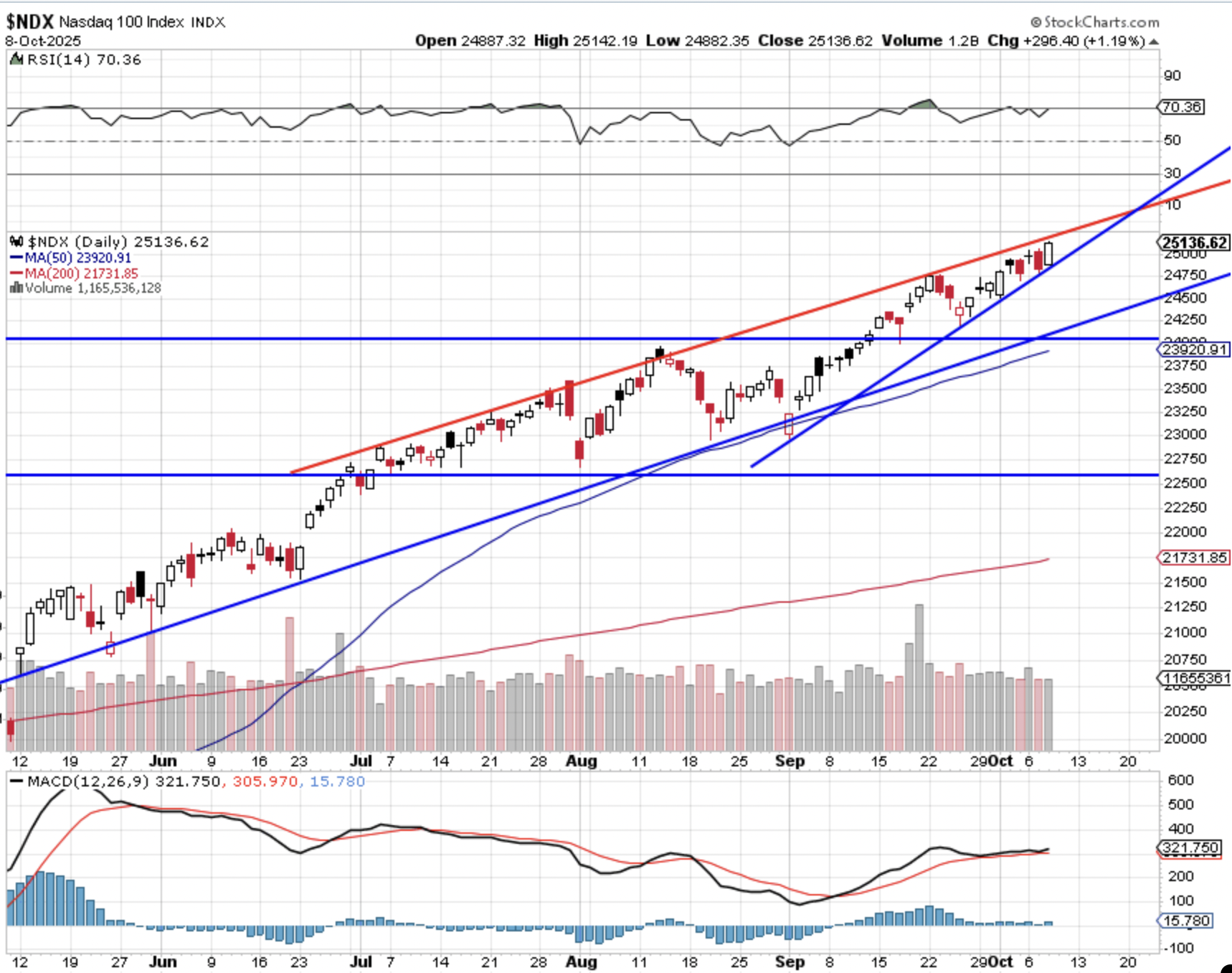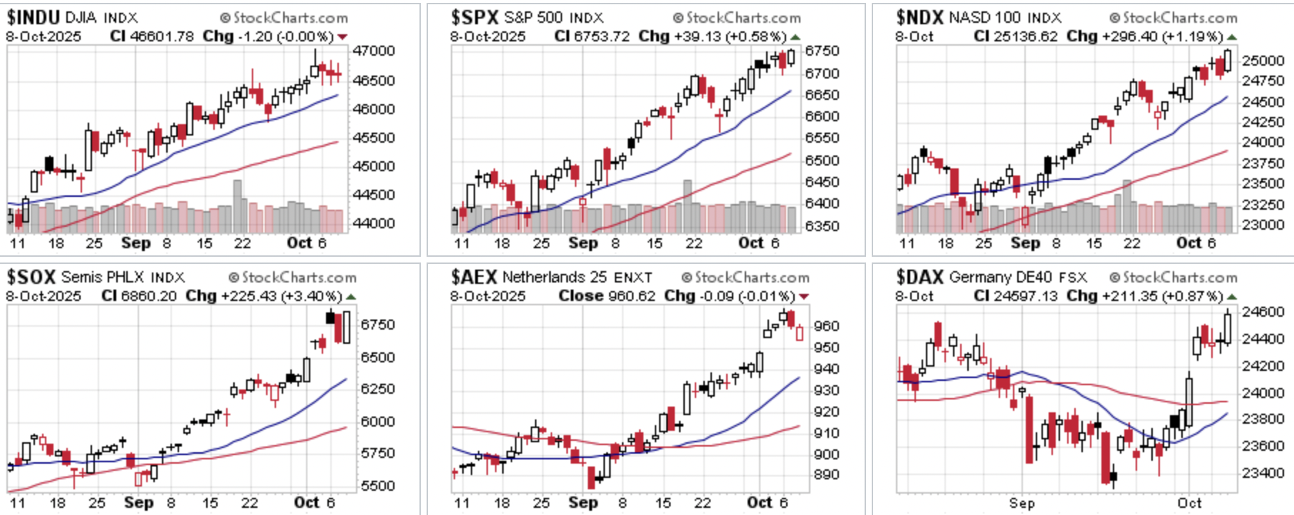Woensdag markeert opnieuw een dag van recordsluitingen voor onder andere de S&P 500, de Nasdaq en de DAX. Beleggers reageren op de notulen van de Fed-vergadering in september, waarin wordt verwacht dat de Federal Reserve dit jaar nog twee keer de rente met 25 basispunten zal verlagen. De S&P 500 sloot af op 6.753 punten, een nieuw record, terwijl de Nasdaq met een stijging van 255 punten op 23.043 punten het hoogste slot ooit bereikte. De Dow Jones bleef vrijwel vlak, terwijl de AI-gerelateerde aandelen juist weer zeer sterk presteerden. Ook in Europa blijven de indices over het algemeen positief ondanks de economische tegenwind en politieke onzekerheid. Goud en andere edelmetalen bereikten eveneens recordhoogtes, wat duidt op een zoektocht naar veilige havens. De dollar werd wat sterker woensdag.