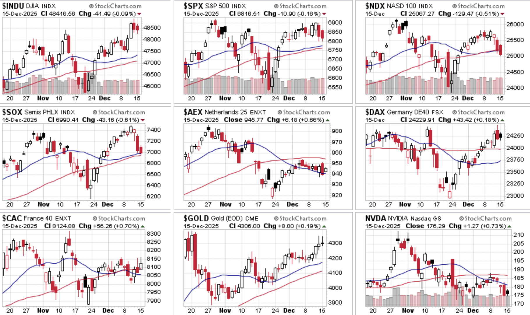 Als we inzoomen op de grafieken van 15 december, zien we een glasheldere divergentie tussen de Amerikaanse technologiesector en de bredere markt, terwijl Europa voorzichtig uit een dal kruipt. Hieronder zie je de technische highlights.