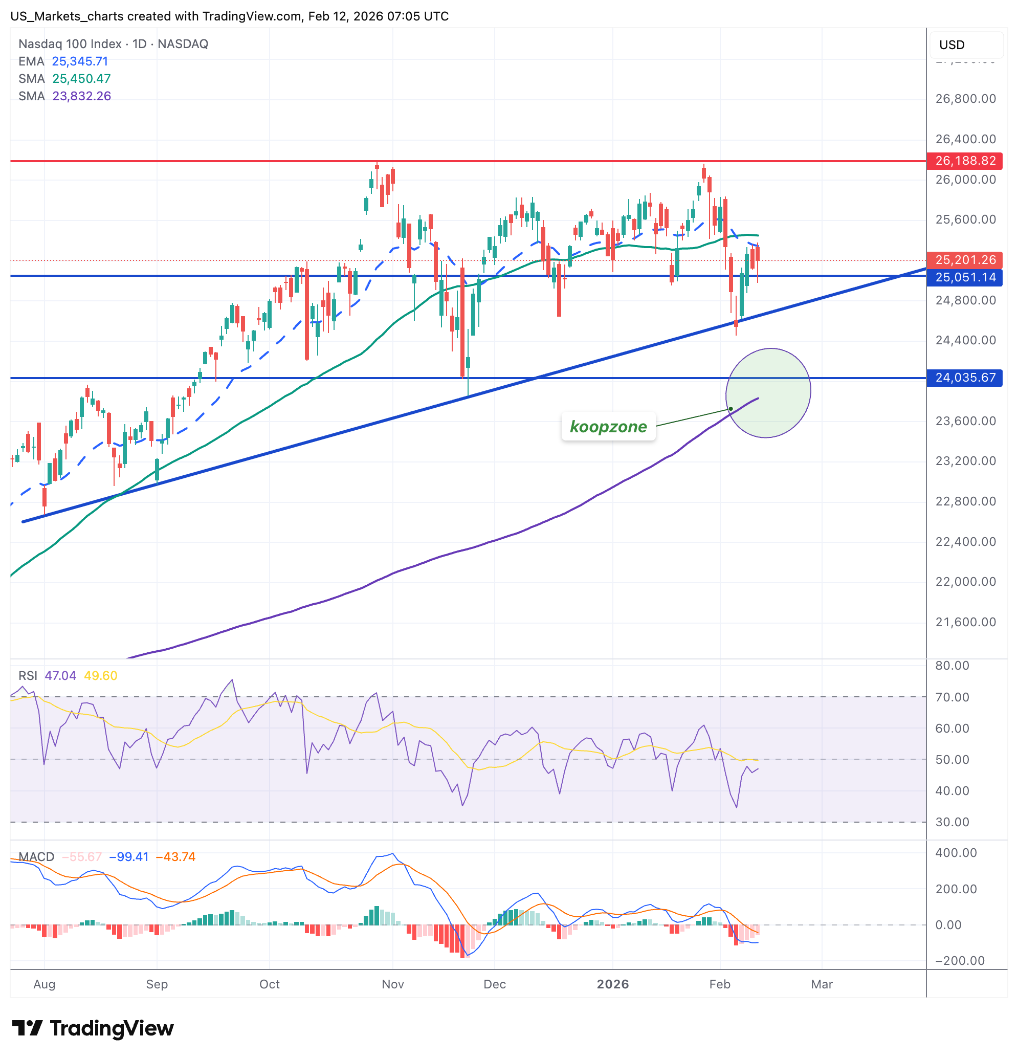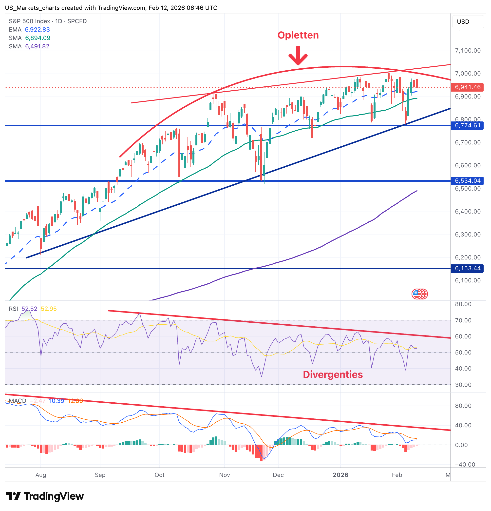 De afstand tot de recente all-time highs geeft een goed beeld van waar we momenteel staan. De S&P 500 noteert op 6.941, amper 1% onder het record van 7.002 (28 januari). De Nasdaq 100 staat rond 25.100 en dat is circa 4% onder de top van 26.182. De Dow Jones sloot met 50.121 iets lager maar blijft en boven de 50K en dicht bij de hoogste stand ooit.
