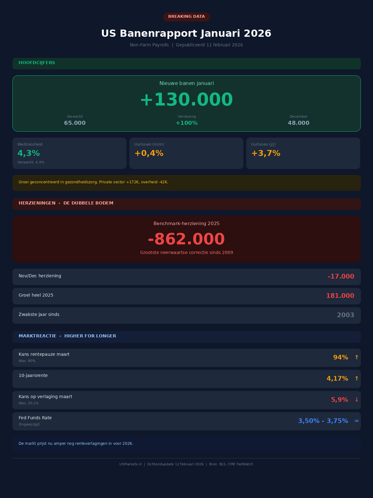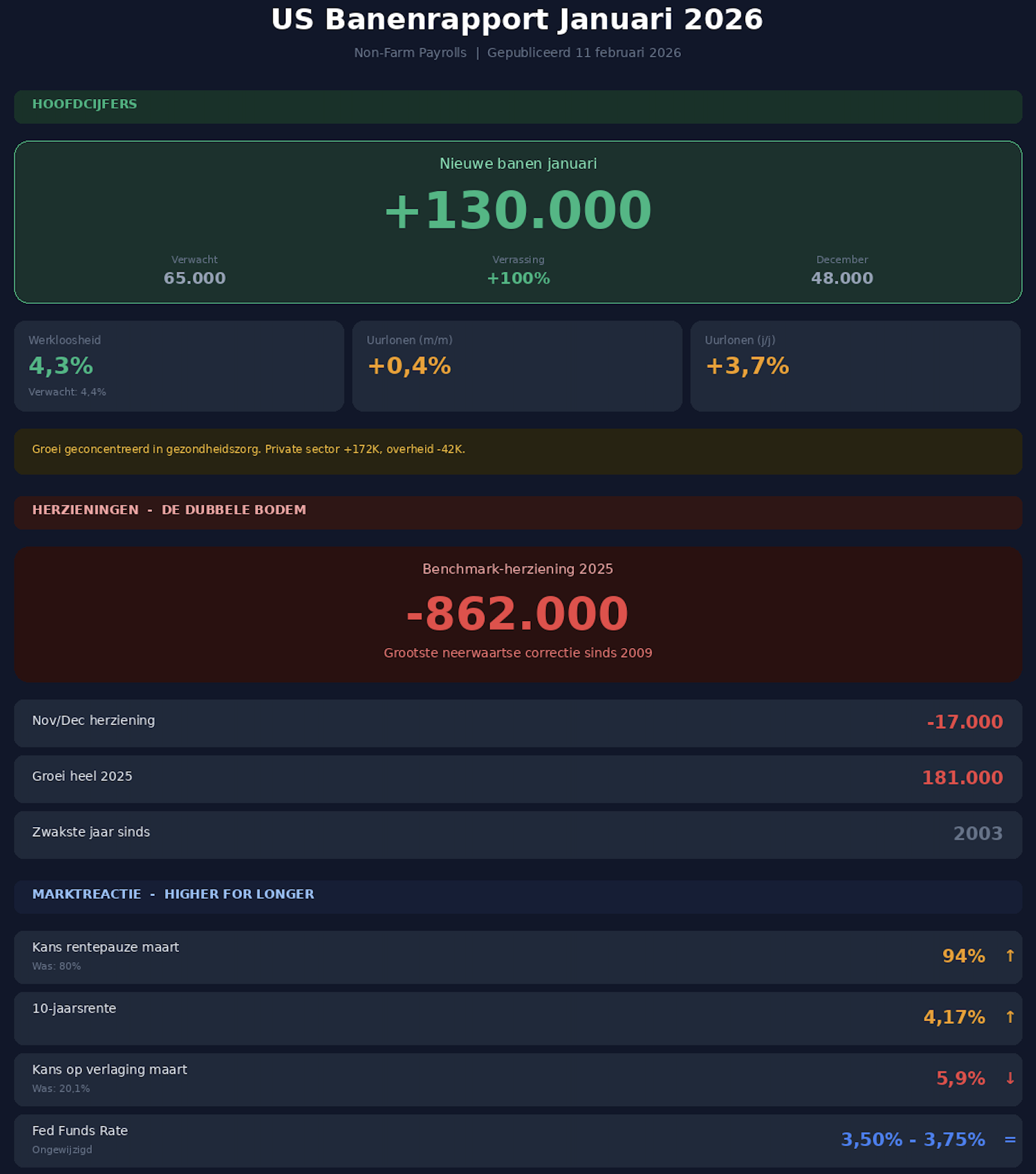 Maar er zit toch een duidelijke dubbele bodem in dit rapport. De groei concentreerde zich in de gezondheidszorg en sociale dienstverlening. De cijfers over november en december werden met 17.000 banen neerwaarts herzien. Nog opvallender: de jaarlijkse benchmark-herziening liet een forse neerwaartse aanpassing zien van 862.000 banen, en dat was de grootste sinds 2009. De werkgelegenheidsgroei over heel 2025 kwam daarmee uit op slechts 181.000 banen, zelfs het zwakste jaar sinds 2003.