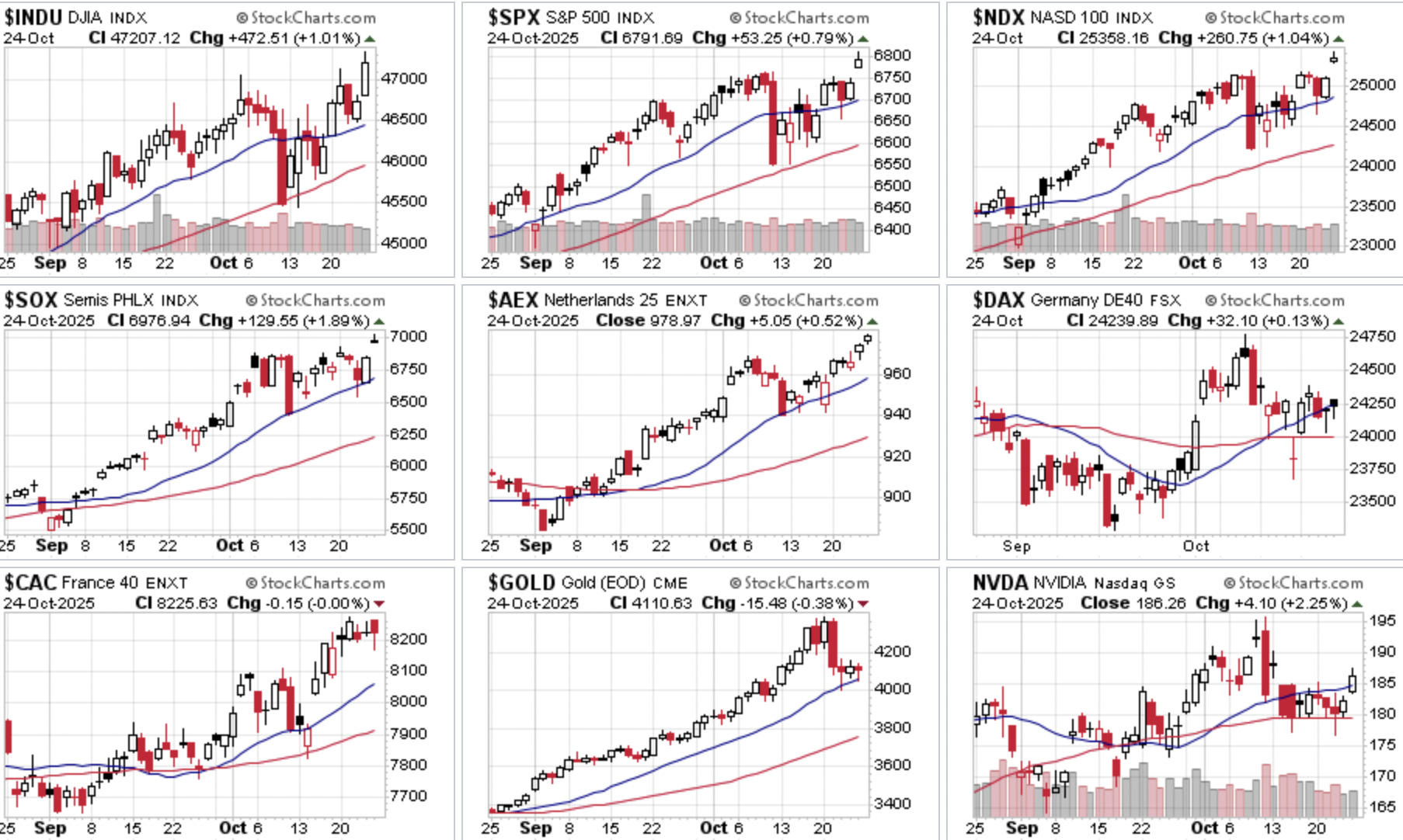 De wereldwijde aandelenmarkten sloten dus overwegend hoger, waarbij technische signalen verdere kracht bevestigen. De AEX zette met een stijging van 0,5% tot 979 punten overtuigend een nieuw record neer. Er zou een versnelling op gang kunnen komen tot de 1.000 punten maar dat moeten we nog zien met Wall Street dat zeer hoog uitkomt. Op weekbasis noteert de AEX index een winst van +2,4%, ondersteund door bedrijven als ASML en ING.
