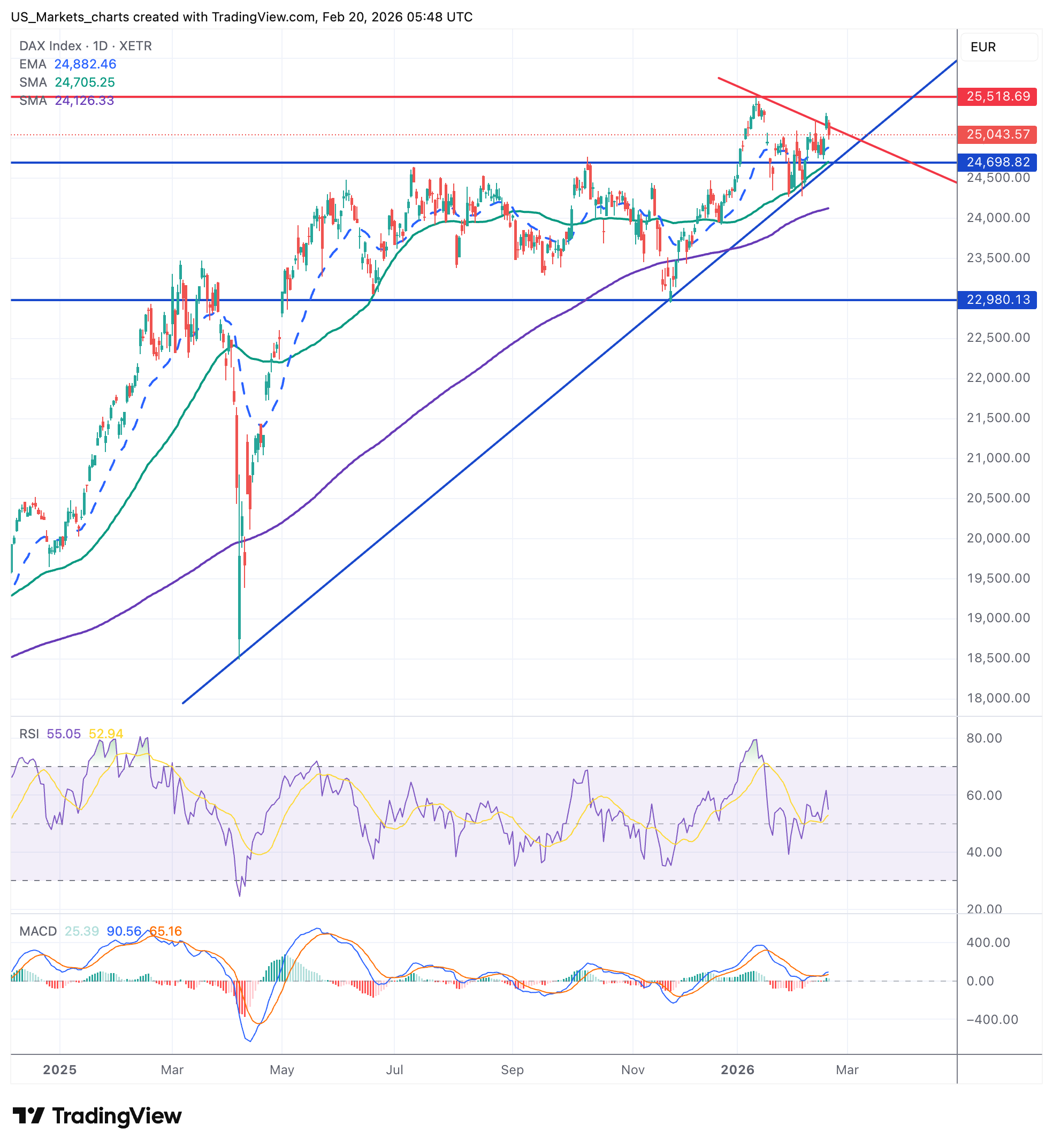 **DAX**: De DAX sloot op 25.044 na een daling van bijna 1% en bevindt zich daarmee nog ruim boven het steun niveau van 24.700. De RSI staat op 55 en de MACD is positief maar afvlakkend. De stijgende trend biedt steun rond 22.980 punten. Op korte termijn is de zone 24.700-25.000 bepalend.