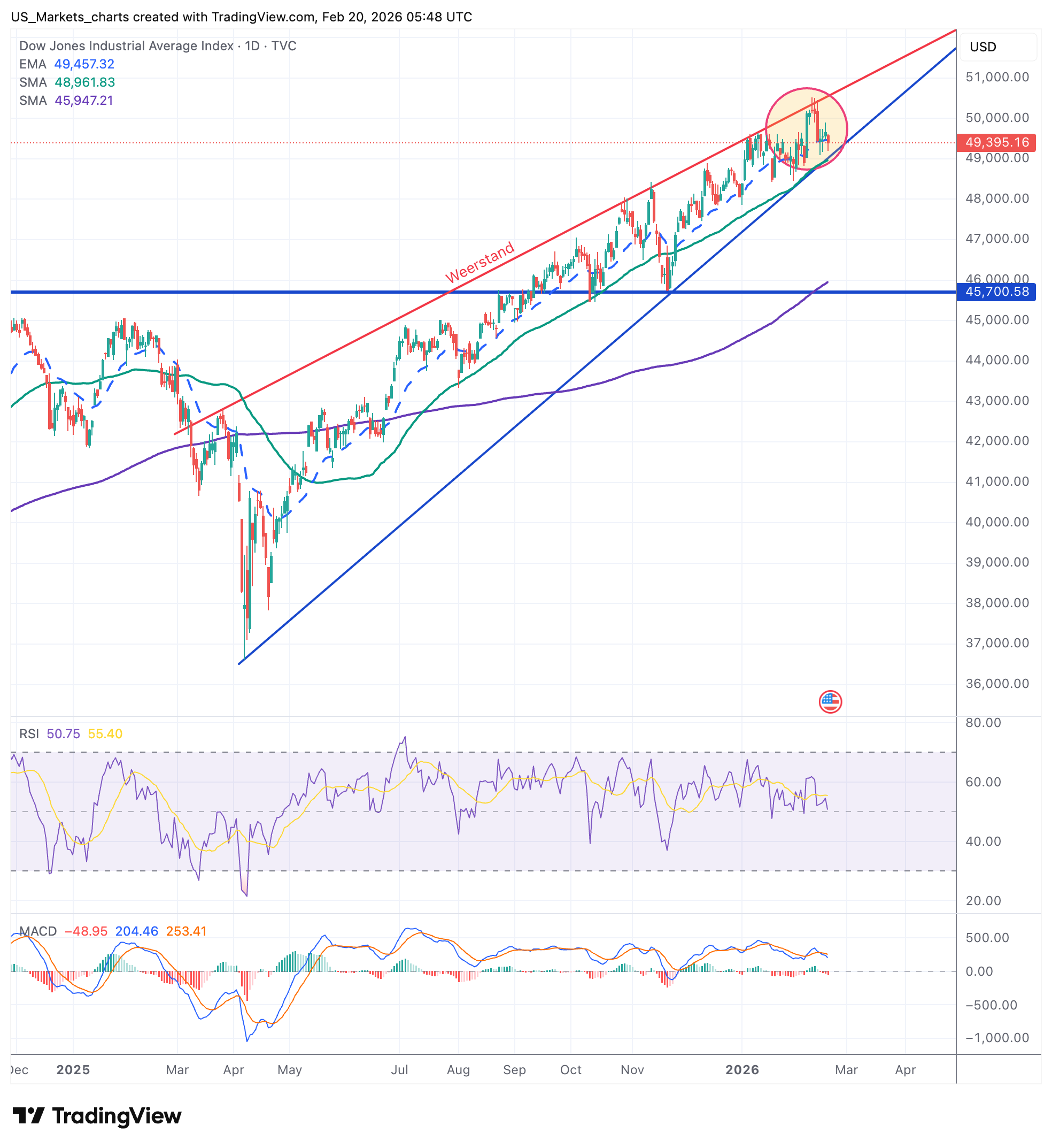 **Dow Jones**: De Dow bereikte recent de top van het stijgende kanaal maar draait nu af. De index noteert rond 49.395, net onder de EMA-20 (49.457). De RSI staat neutraal op 50,75 en de MACD is licht negatief. De weerstandslijn boven de markt en de dalende hoogtepunten suggereren dat we voorzichtig moeten zijn met longposities richting de bovengrens van het kanaal.