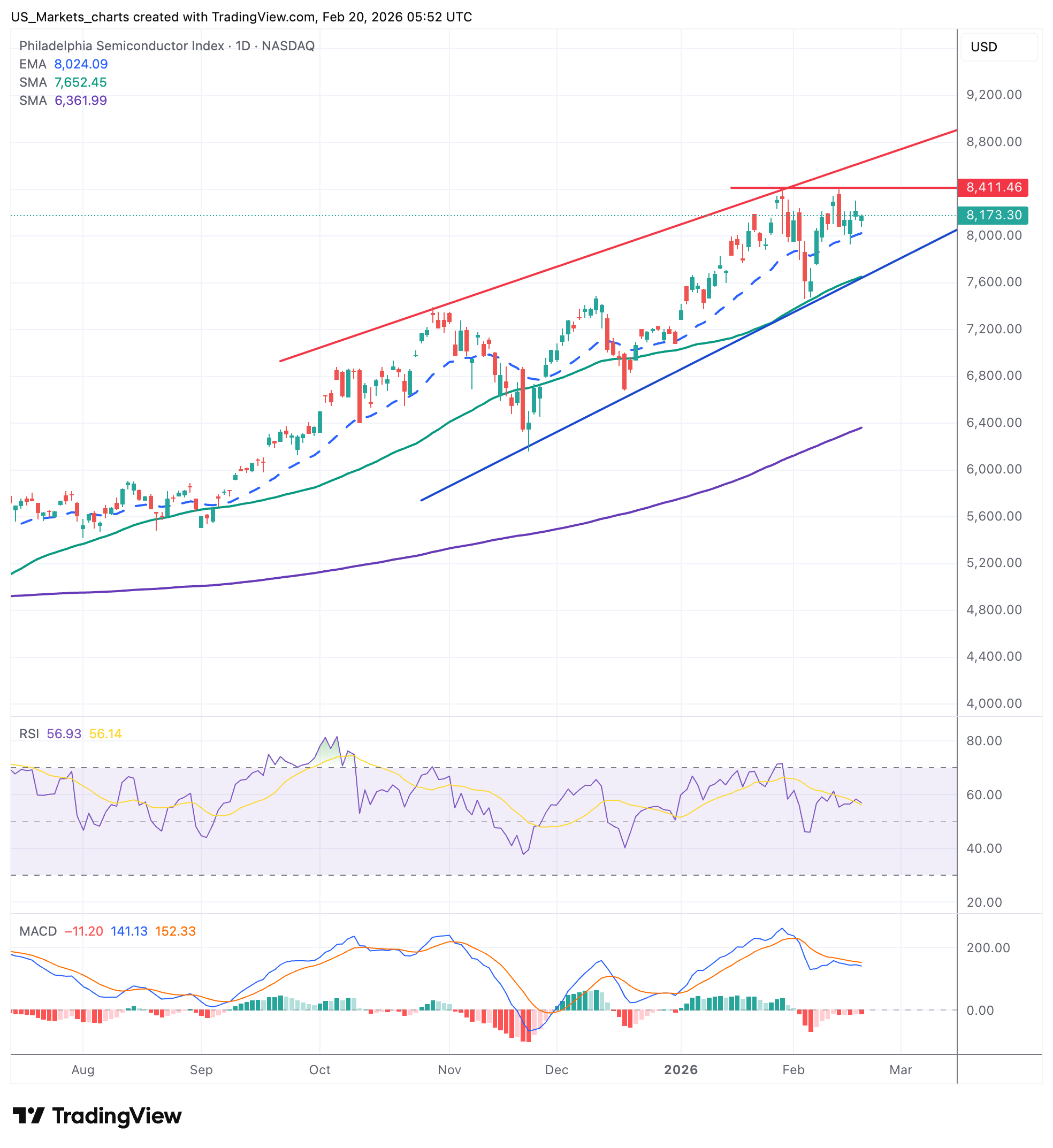 **SOX (halfgeleiders)**: De SOX index noteert rond 8.173, boven de EMA-20 (8.024) maar onder de weerstand van 8.411. De RSI op 57 is neutraal en de MACD is licht negatief. De index beweegt in een stijgend kanaal, maar de bovenkant is voorlopig buiten bereik. De steunlijn van het kanaal loopt rond 8.000. Met de NVIDIA-cijfers volgende week woensdag op het programma wordt dit een belangrijk ijkpunt voor deze sector.