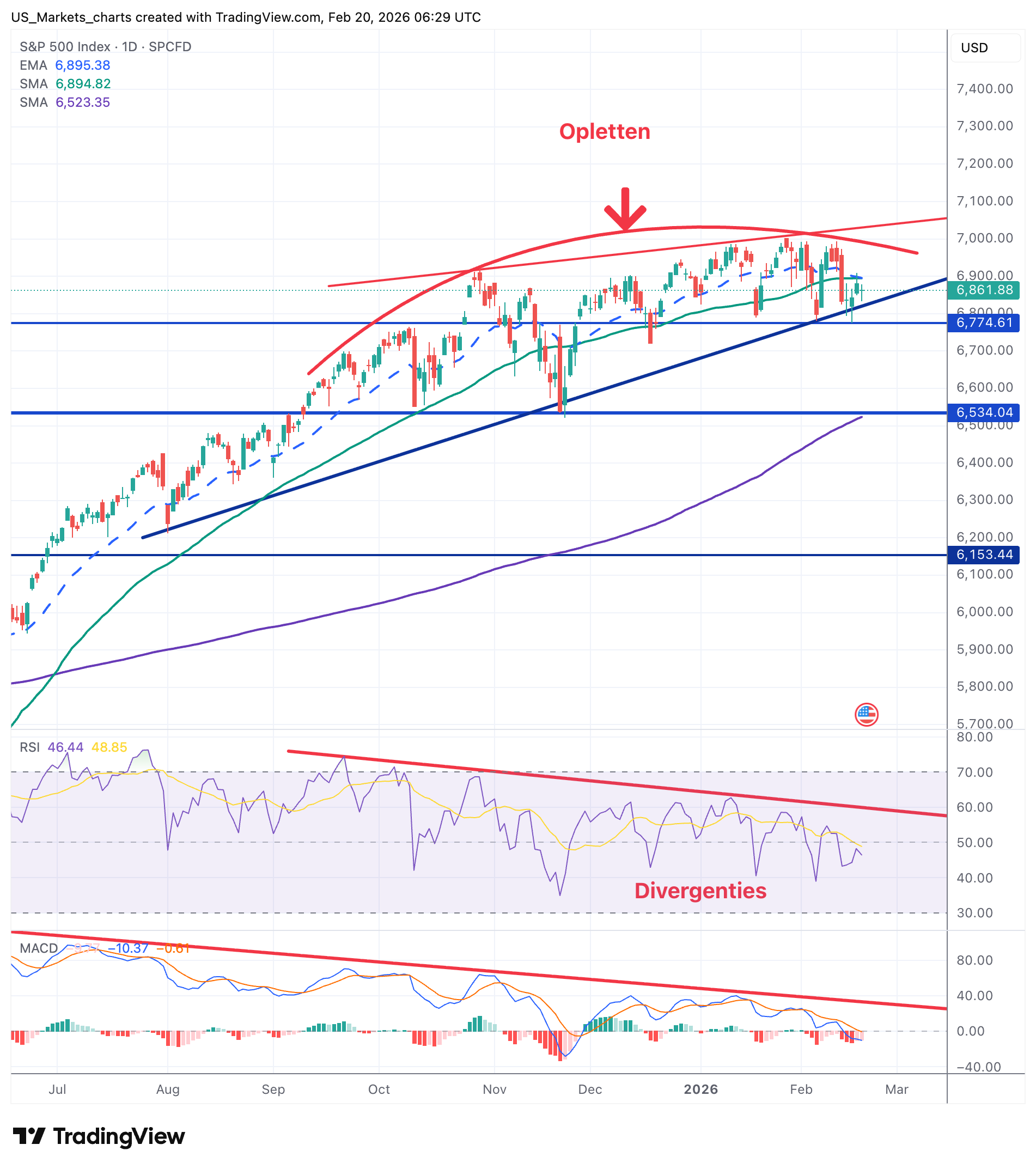 **S&P 500**: De S&P 500 consolideert rond 6.862, net onder de EMA-20 (6.895) en SMA-50 (6.895). Opvallend zijn de divergenties bij de RSI: terwijl de koers hogere toppen probeert te vormen, maakt de RSI lagere toppen. Dat is een klassiek waarschuwingssignaal. De steun ligt bij 6.775, gevolgd door de stevige vloer bij 6.535. De rode pijl op de grafiek spreekt boekdelen.