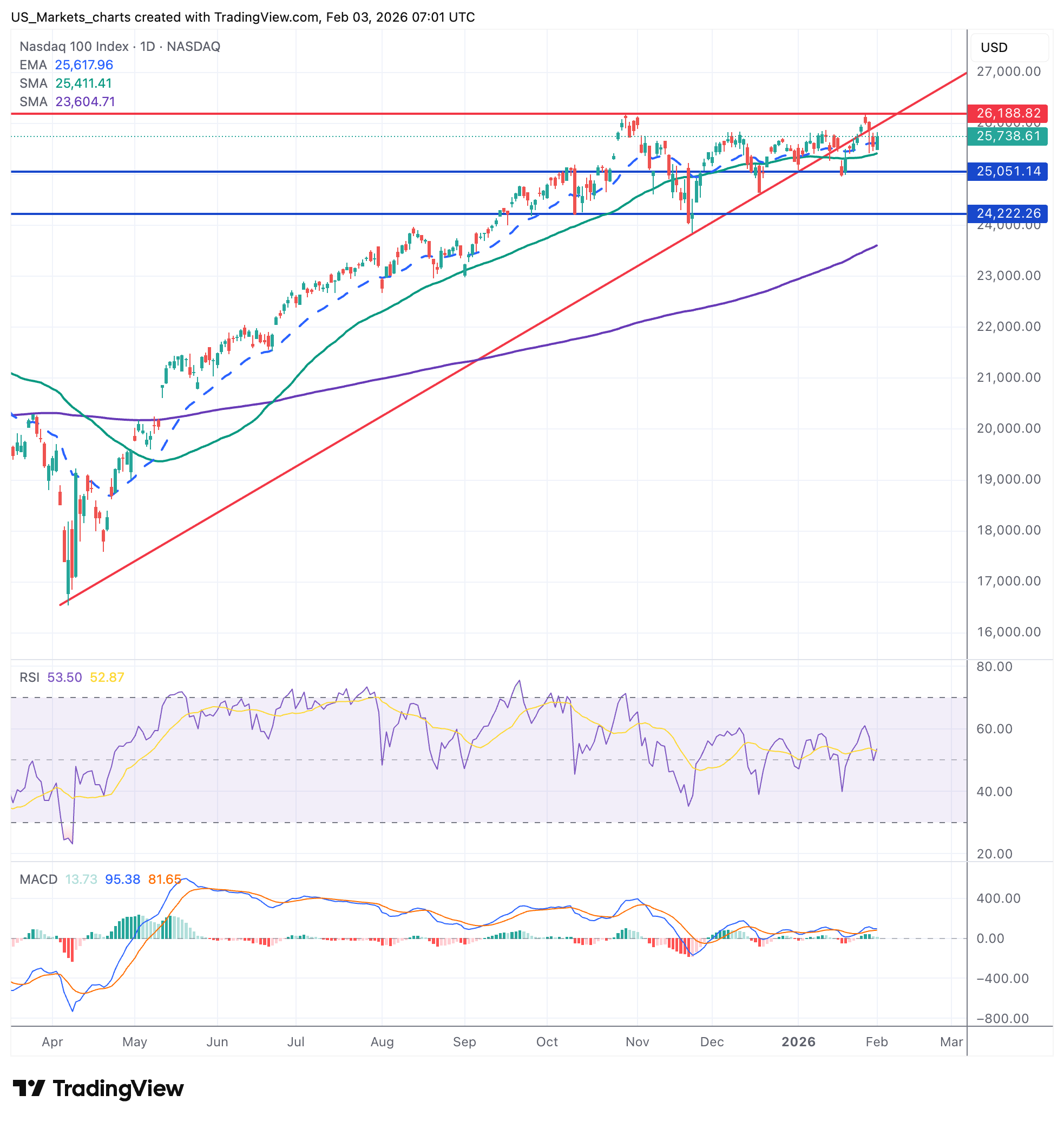 Steun ligt rond 25.400 punten, waar de 50-daagse gemiddelde lijn houvast kan bieden. Een doorbraak boven 26.200 punten zou de weg vrijmaken naar nieuwe recordhoogtes die dan wachten rond de 26.500 en 26.750 punten. Daalt de index onder 25.400 punten dan ligt de weg open tot eerst de 25.100 en later tot de 24.750 punten.
