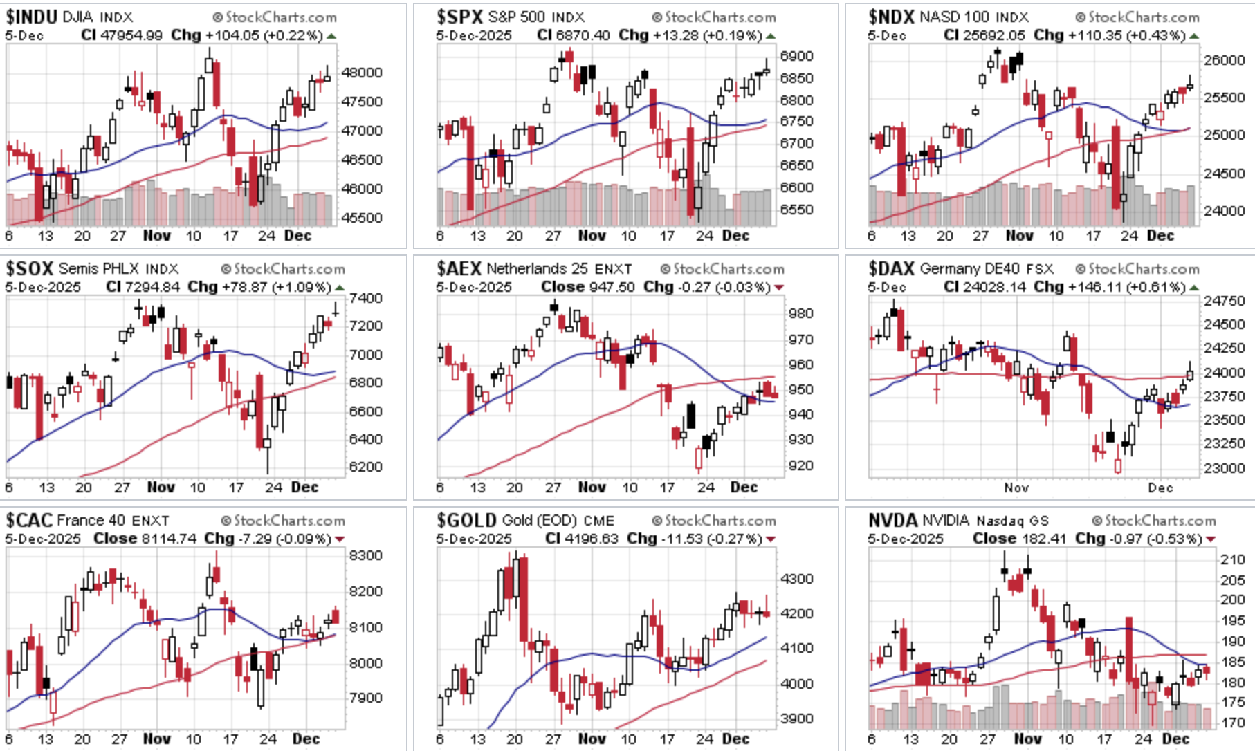 Technisch ogen de markten in een soort afwachtende houding net onder nieuwe records, de trend blijft opwaarts gericht. De correcties blijven voorlopig oppervlakkig en volatiliteit blijft wisselend. Zolang de S&P 500 en de Nasdaq 100 niet duidelijk onder hun recente bodems zakken dan blijft het basisscenario een voortzetting van de eindejaarsrally. We letten wel op het belangrijke Fed‑commentaar later deze week want dat kan voor een kortstondige schrikreactie zorgen.