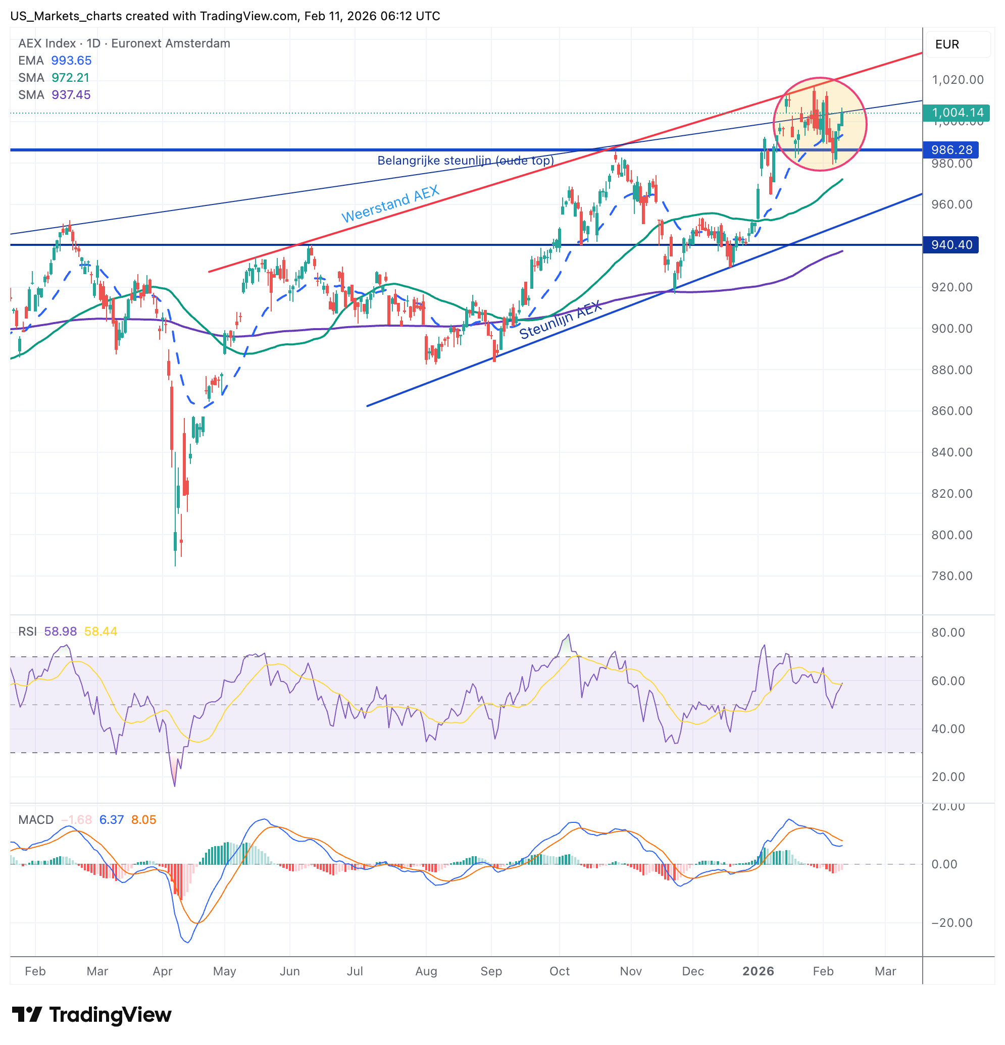 - AEX: 999 (+0,37%) gestaag hoger, geleid door banken en tech