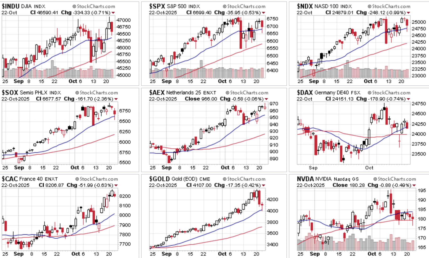 De markten staan onder druk door een mix van geopolitieke en economische onzekerheden. Amerikaanse futures laten vanmorgen wel een gemengd beeld zien, terwijl de grote indices dinsdag overwegend lager sloten. Na tegenvallende kwartaalcijfers van Tesla en IBM blijven beleggers voorzichtig. Opvallend is dat de Amerikaanse schuld tot een record van 38 biljoen dollar oploopt. China staat nu onder druk door de Amerikaanse sancties op Russische oliebedrijven. Dit zorgt voor verstoringen op de wereldmarkt en hogere olieprijzen. Daarnaast houdt de voortdurende Amerikaanse government shutdown, nu al ruim drie weken aan, de politieke sfeer blijft gespannen. Goud en zilver tonen volatiele bewegingen, er komen al voorspellingen voorbij dat het goud mogelijk tot $5.000 per ounce kan stijgen. De Amerikaanse regering onderzoekt nu de mogelijkheden om te investeren in quantumcomputer bedrijven ...