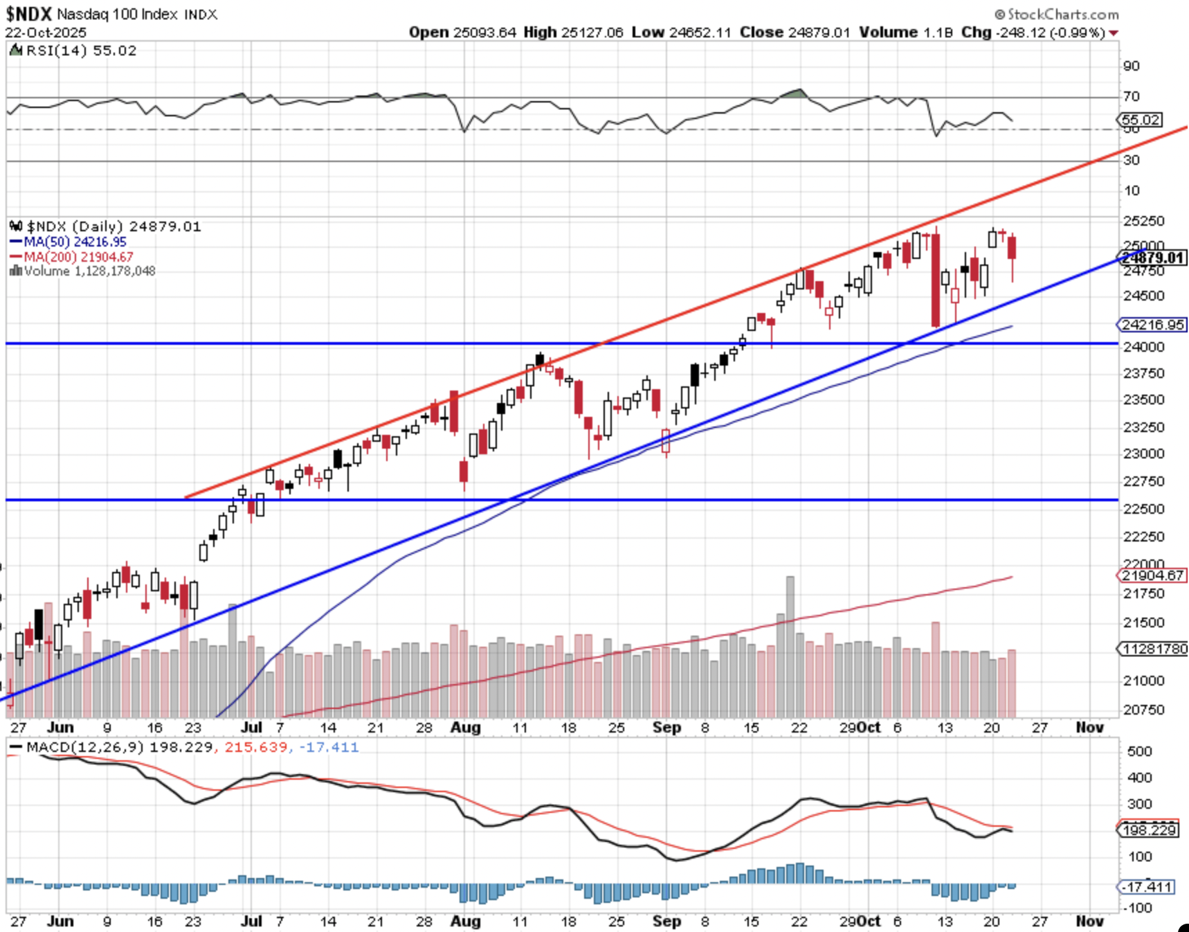 - Pas als de Nasdaq 100 onder de 24.200 punten zakt, ziet het er snel minder goed uit, dan zakt de index onder het 50-MA