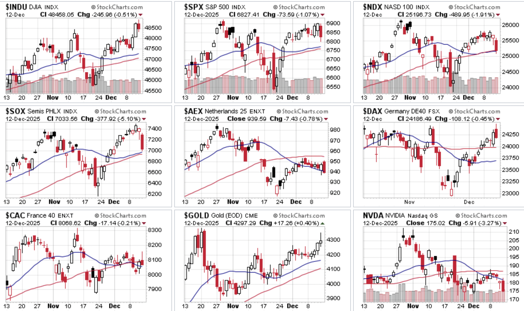Vrijdag kregen we dan toch het kantelpunt van de week, na de eerdere euforie door de lagere rentes schoof het sentiment abrupt naar risk-off, met een scherpe afbouw in AI/tech en semiconductors als rode draad. Vooral de late cijfers van Oracle en Broadcom waren daar de oorzaak van, eerst knalden deze aandelen fors omhoog door de aangekondigde zeer forse investeringen in AI maar nu vraagt men zich al af wie, wat en vooral wanneer dat zal worden terugbetaald. De vraag is nu wat er na de “damage control”-sessie gaat gebeuren? Stabiliseert de Nasdaq/SOX ofwel de technologie sector zich snel na de klap? Of volgt er nog een tweede verkoopgolf?